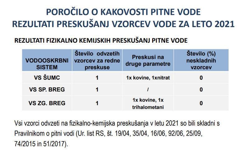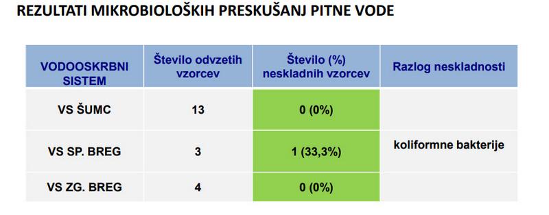Mikrobiološko neskladen je bil samo 1 od skupno 20 vzorcev. Skladnost pitne vode je bila dosežena v 95 % vzorcev. Razlog mikrobiološke neskladnosti je bil odpravljen nemudoma, tako da tveganja za