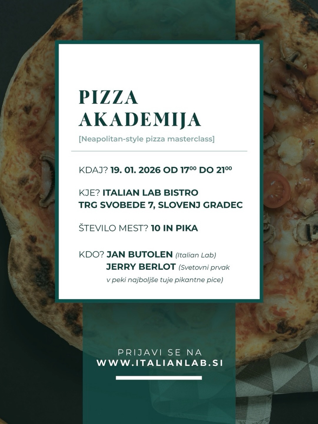 Pizza Akademija je popoldne, kjer bosta Jan Butolen, idejni vodja in lastnik Italian Lab bistroja ter in Jerry Berlot, svetovni prvak v peki pizze, delila znanje, izkušnje in tiste male stvari, ki v receptih nikoli niso zapisane.