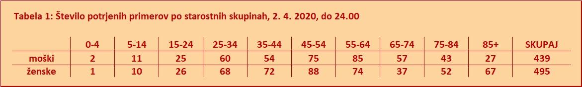 Do 2.4.2020 do 24. ure je bilo po podatkih NIJZ opravljenih 25.921 testiranj, od tega je bilo 948 pozitivnih testov.