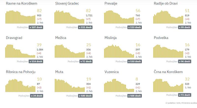 Na Koroškem so v torek po sedem novih okužb potrdili v Slovenj Gradcu, na Ravnah na Koroškem in na Prevaljah. V Radljah ob Dravi, Dravogradu in v Mežici po 4, v Mislinji 3, v Podvelki in Ribnici na Pohorju 2, na Muti in v Vuzenici pa po 1.