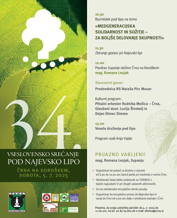 Na Ludranskem vrhu nad Črno na Koroškem bo v soboto, 5. julija 2025, potekalo Srečanje pod Najevsko lipo.