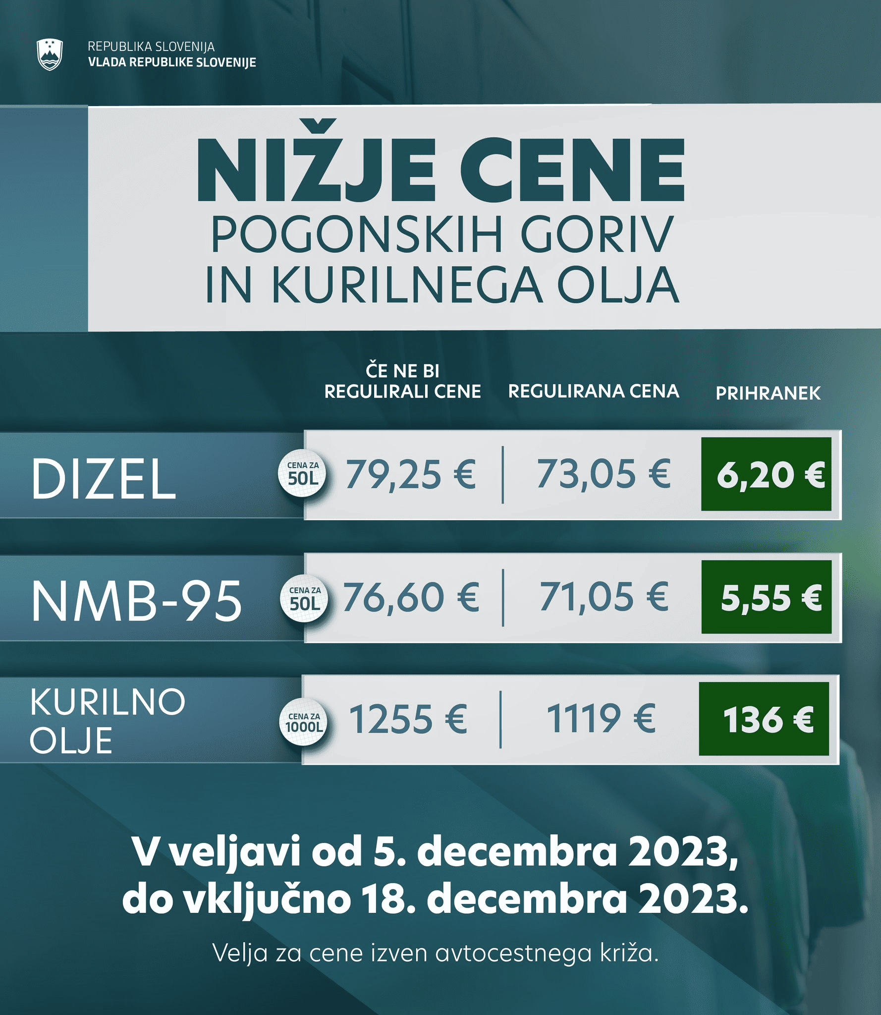 Cene, ki bodo veljale do vključno 18. decembra, že vključujejo odločitev vlade iz minulega tedna, da zniža trošarine in marže za 95-oktanski bencin in dizelsko gorivo. Kot je med drugim pojasnila, s prilagajanjem trošarin zasleduje zaveze na področju doseganja okoljskih ciljev, naslavlja pa tudi gospodarske razmere in ekonomske cilje države. Glede na trenutno visoko inflacijo si mora ob zagotavljanju javnofinančne vzdržnosti prizadevati tudi za ohranjanje čim nižjih maloprodajnih cen, je utemeljila spremembe.