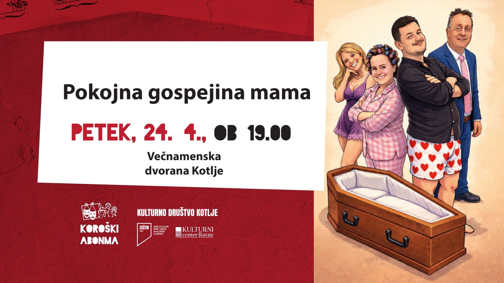 V petek, 24. aprila 2026, vas bo ob 19. uri v Večnamenski dvorani v Kotljah nasmejala predstava Georgesa Feydeauja, Pokojna gospejina mama.