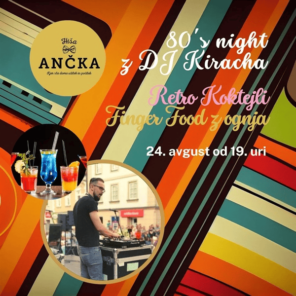 To poletje zaključujejo s prav posebnim dogodkom pri Hiši Ančka! V soboto, 24. avgusta od 19.00 ure dalje, vas vabijo, da se jim pridružite na Partyju z DJ Kiracha in zaplešete pod zvezdami v ritmih 80-ih.
