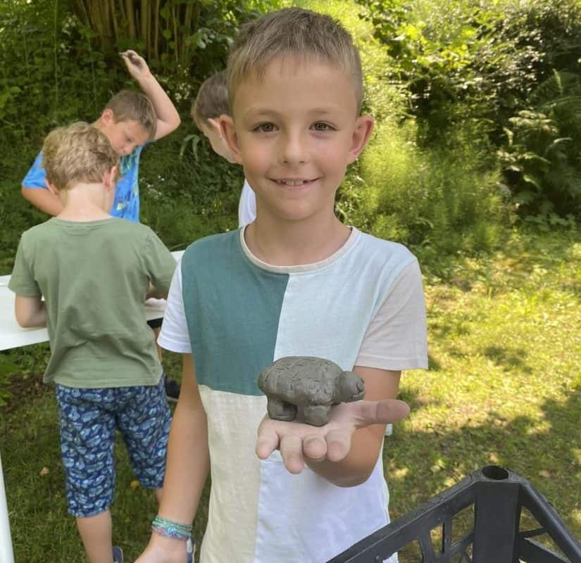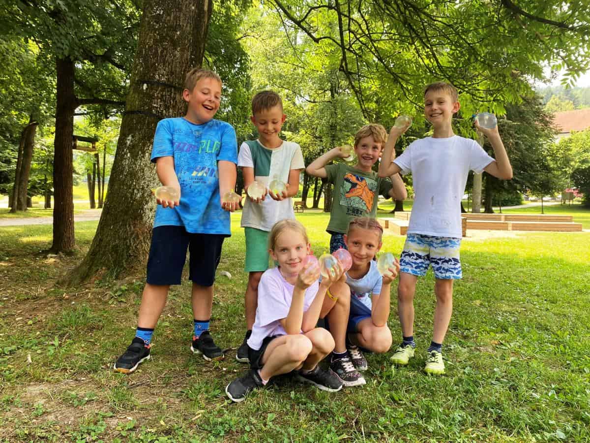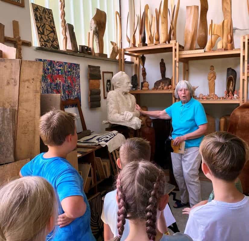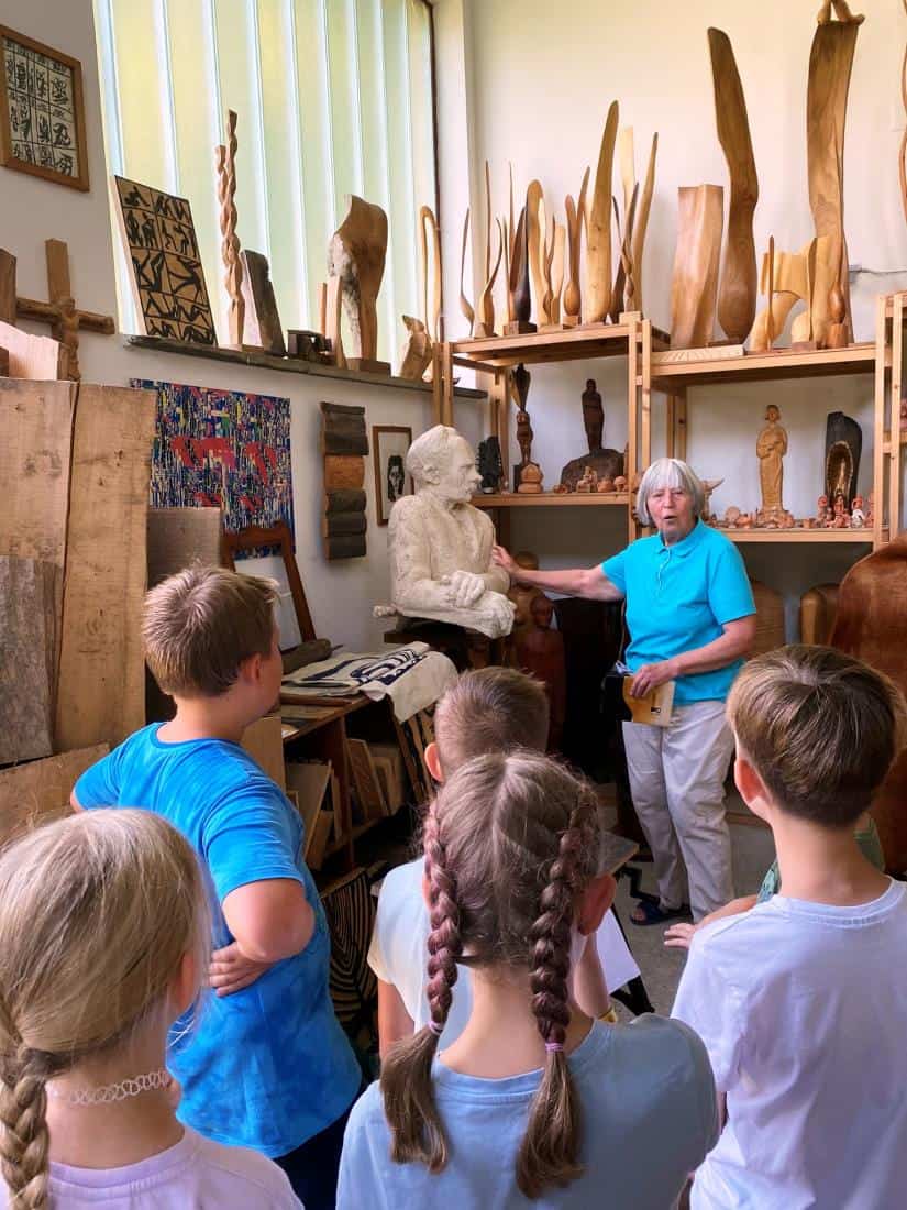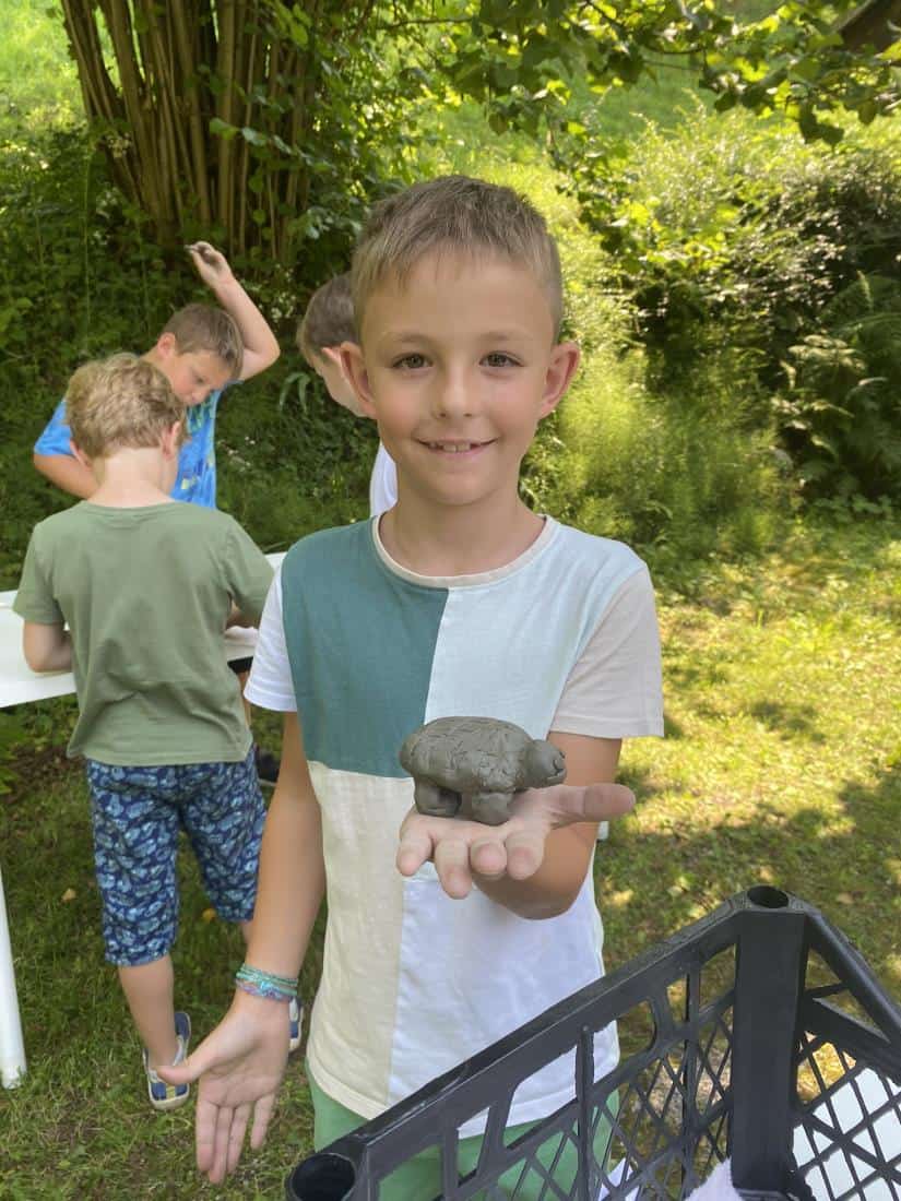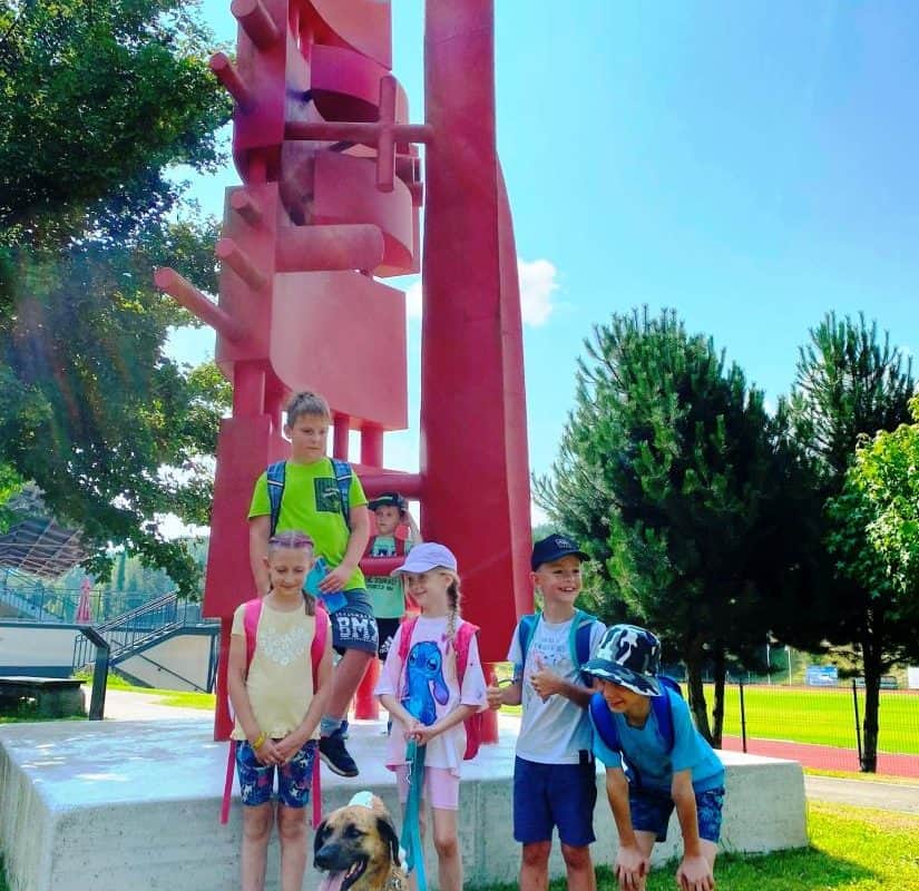 Tudi sreda je bila zelo zanimiva. Dan so jim obogatili zaposleni v Koroški galeriji likovnih umetnosti. Obiskali so galerijo Andreja Grošlja, kjer jim je njegova žena pokazala in povedala veliko o delu umetnika oziroma kiparja. Ustvarjali so z glino ter uživali v učilnici na prostem v Grajskem parku. Družili so se s predstavnicama Zdravstveno vzgojnega centra Zdravstvenega doma Ravne in risali nasmehe. Največji nasmeh pa je bil v petek, ko so se v res vročem tednu ohladili v letnem bazenu in zaključili drugi teden Razgibanega poletja.