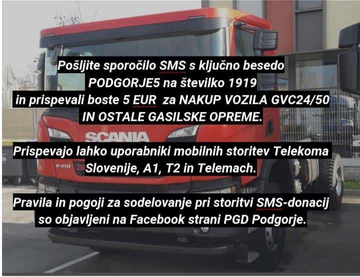Vsi, ki imate možnost pomagati lahko to storite s SMS-om, s ključno besedo PODGORJE5 na številko 1919, darujete 5 evrov za nakup vozila in ostale opreme. "Hvala vsem, ki ste pomagali ali pa še boste, da bodo naši gasilci imeli za reševanje ustrezno in varno opremo," ob tem dodajajo gasilci PGD Podgorje.
