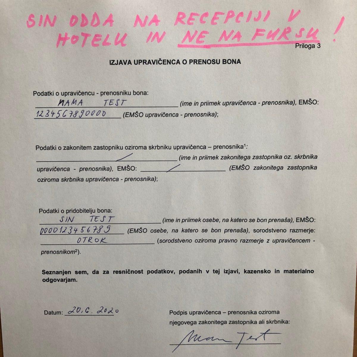 Finančna uprava Republike Slovenije (FURS) vse upravičence turističnih bonov obvešča, da morajo imeti vse izpolnjene in podpisane izjave o prenosu bona s seboj v nastanitvi, kjer bodo bon unovčili.