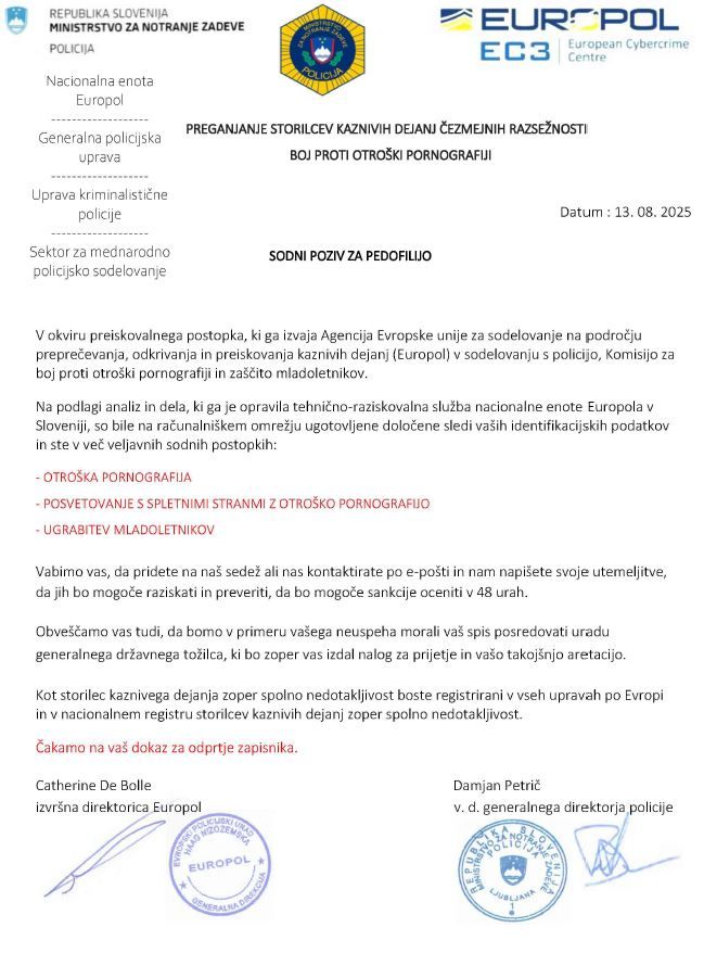 Policija ponovno prejema prijave o širjenju lažnega dopisa, ki ga v imenu policije pošiljajo spletni goljufi, zato znova opozarjajo na previdnost. Na tovrstna sporočila se ne odzivajte.