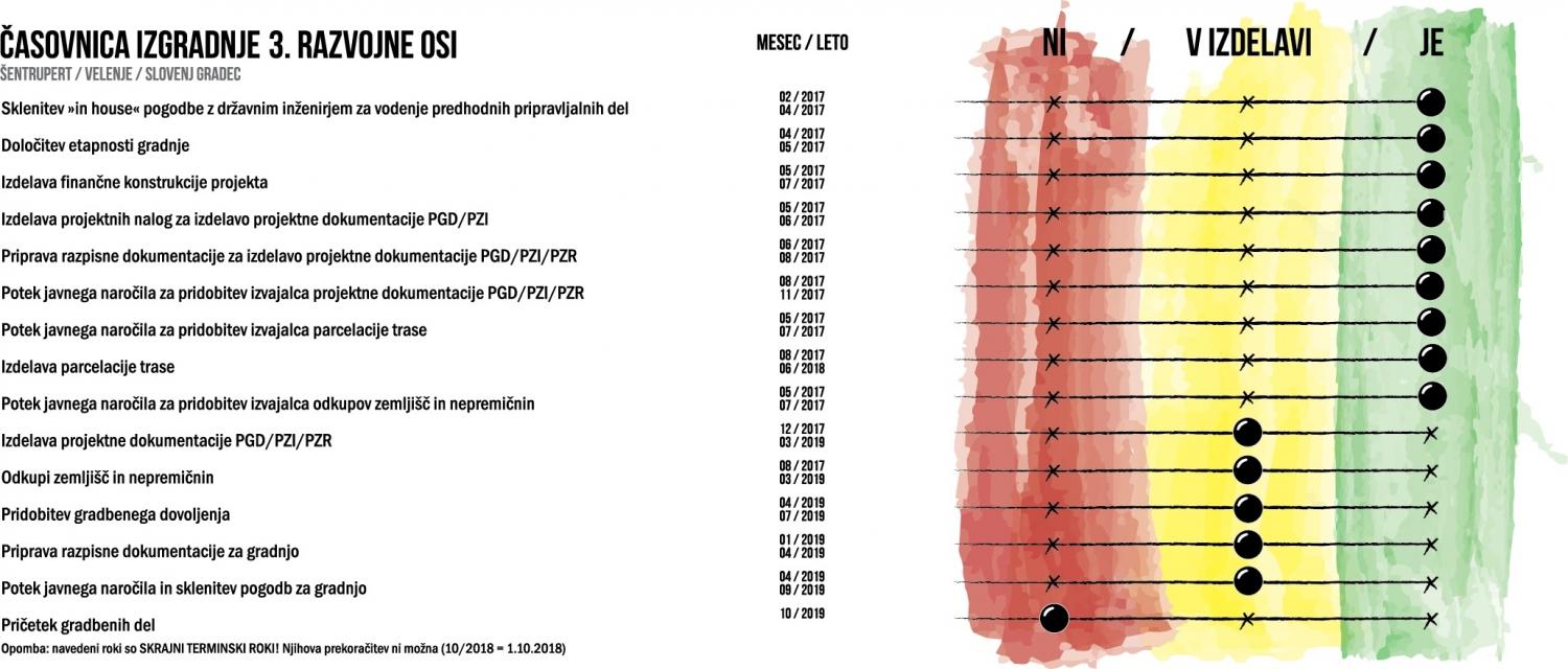 Mladinska iniciativa za 3. razvojno os je dne, 28. oktobra 2019, posodobila semafor izgradnje 3. razvojne osi. Podatke jim je poslala Družba za avtoceste Republike Slovenije. Od zadnje posodobitve semaforja, avgusta 2018, sveti samo še ena rdeča luč. Ta predstavlja pričetek gradbenih del. Za izdelavo finančne konstrukcije projekta je končno zasvetila zelena luč. Rumeno so zasvetili pridobitev gradbenega dovoljenja, priprava razpisne dokumentacije za gradnjo in potek javnega naročila in sklenitev pogodb za gradnjo. To pomeni, da so aktivnosti v teku, so danes sporočili iz Mladinskega sveta Ravne.