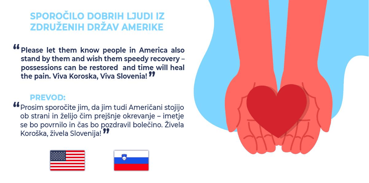 »Please let them know people in America also stand by them and wish them speedy recovery – possessions can be restored and time will heal the pain. Viva Koroska, Viva Slovenia!«