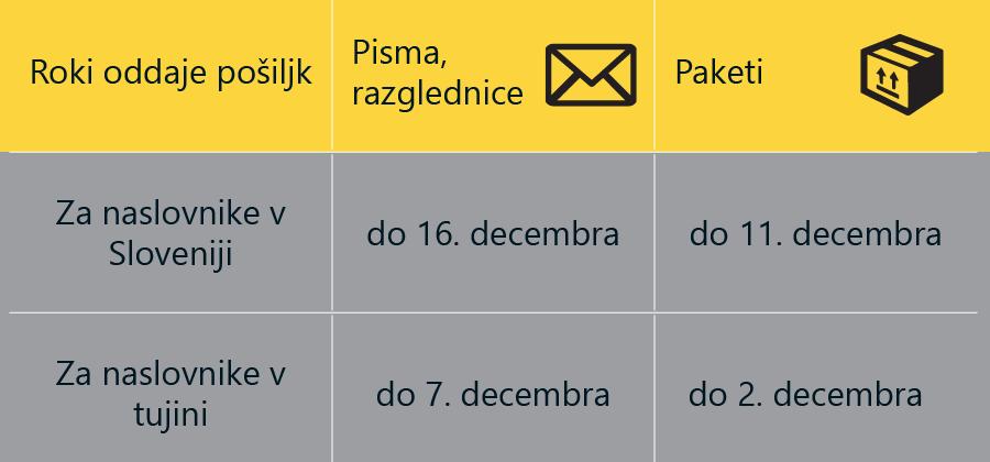 Zaradi izjemne rasti spletnega nakupovanja Pošta Slovenije strankam priporoča, da paketne pošiljke za naslovnike v Sloveniji v letošnjem letu oddajo do 11. decembra, za tujino pa do 2. decembra. Priporočen rok oddaje pisemskih pošiljk za naslovnike v Sloveniji je do 16. decembra, za naslovnike v tujini pa do 7. decembra 2020.