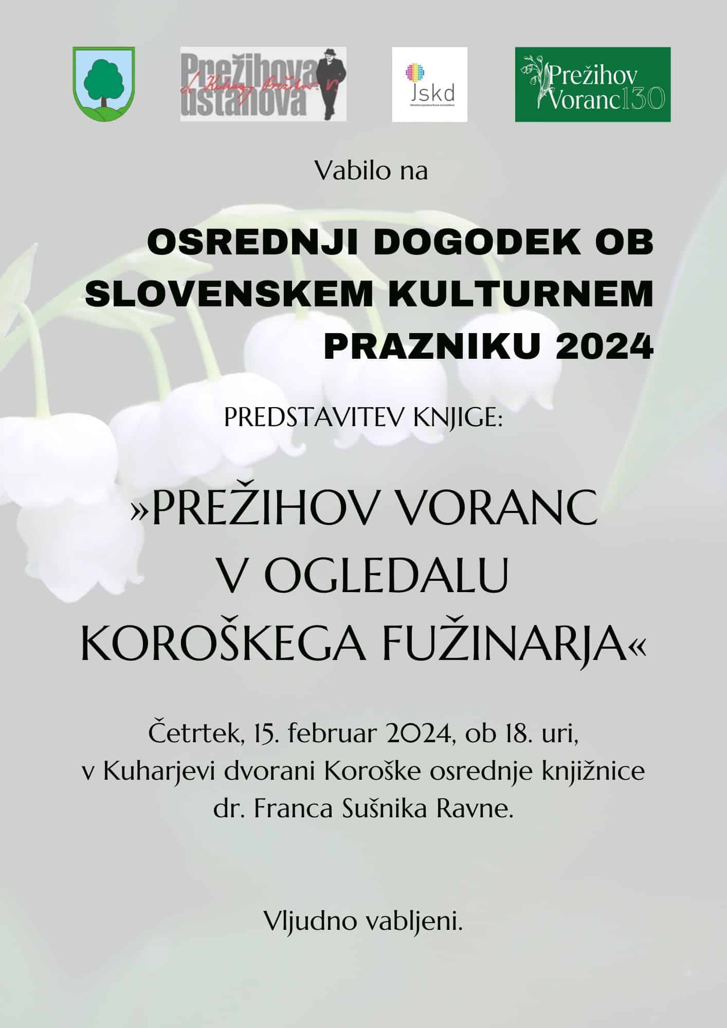 Vabljeni na osrednji dogodek ob slovenskem kulturnem prazniku, na predstavitev knjige Prežihov Voranc v ogledalu Koroškega fužinarja, ki bo v četrtek, 15. februarja 2024, ob 18. uri v Kuharjevi dvorani Koroške osrednje knjižnice dr. Franca Sušnika.