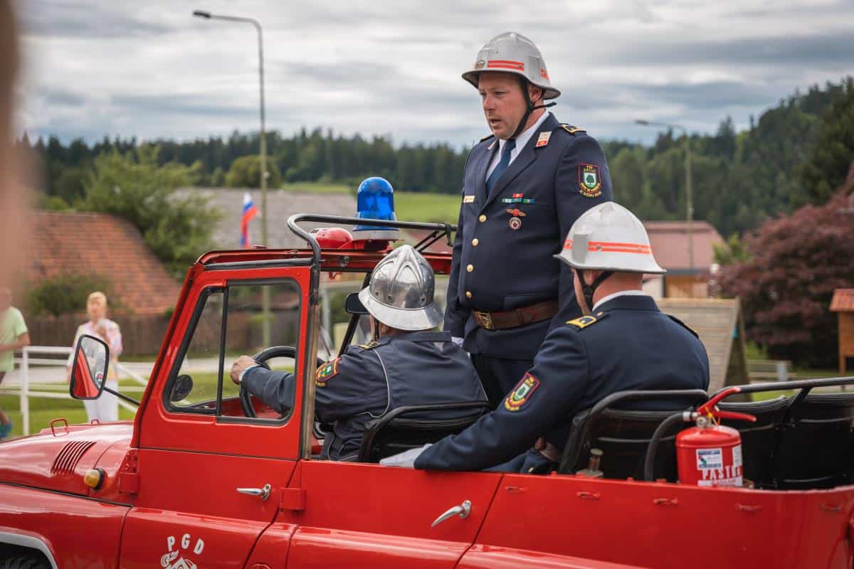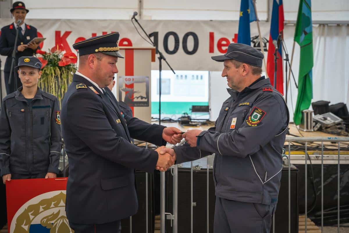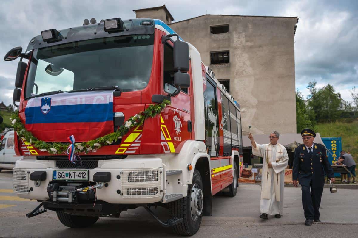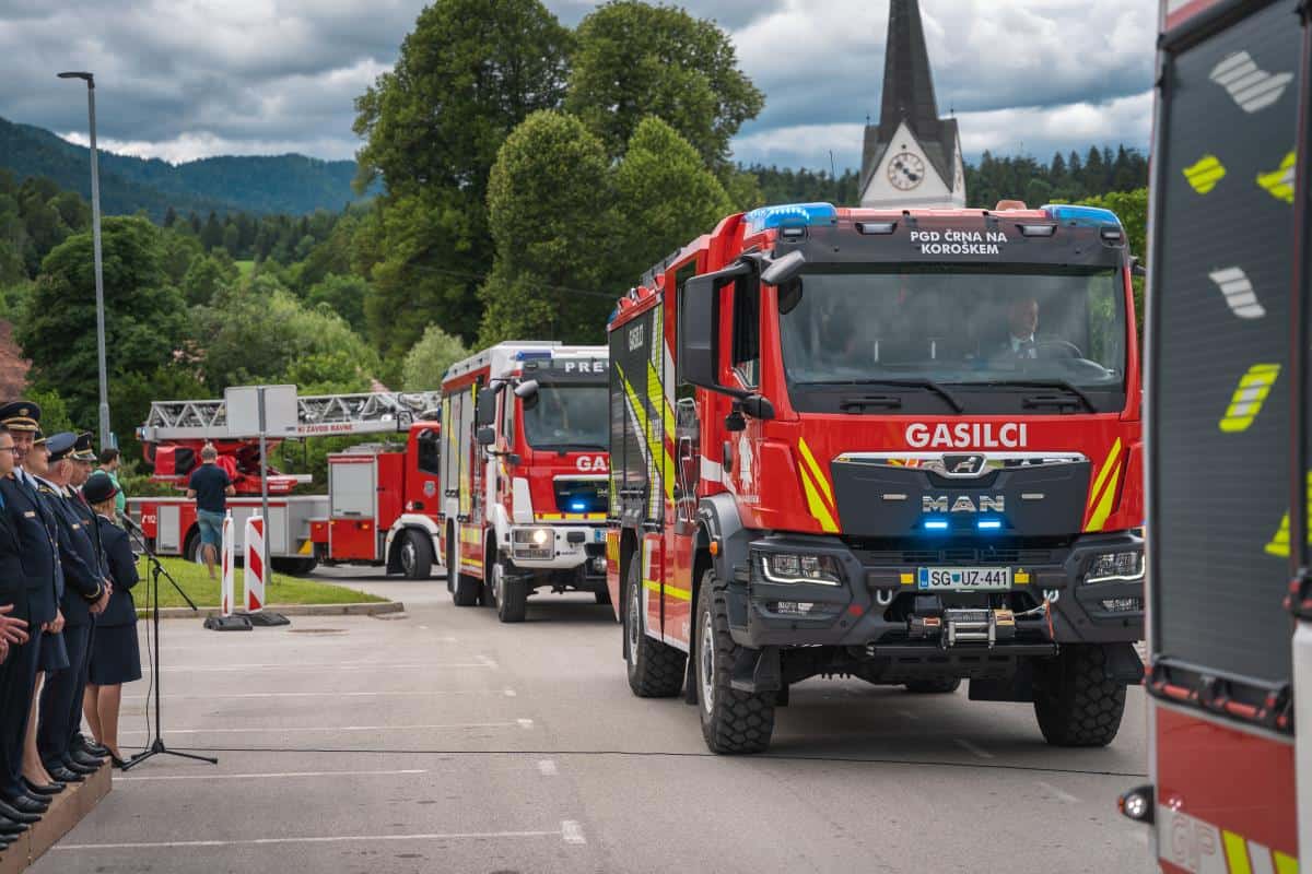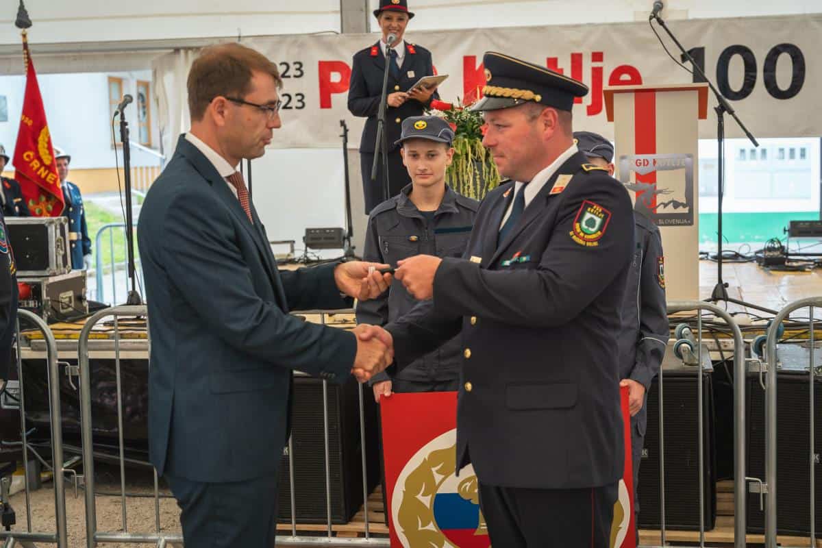 Župan dr. Tomaž Rožen je ključe vozila prevzel od predstavnika Koroškega gasilskega zavoda Davida Vaukmana in jih izročil poveljniku PGD Kotlje Urošu Prazniku, ta pa strojnemu referentu PGD Kotlje Danilu Luterju.