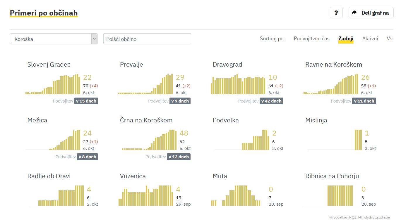 Največ novih okužb so odkrili v občini Slovenj Gradec (+4), sledijo Prevalje, (+2), Dravograd (+2), Ravne na Koroškem (+1) in Mežica (+1).