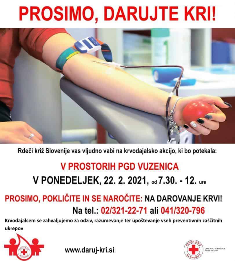 Rdeči križ Slovenije vas vabi na krvodajalsko akcijo, ki bo potekala v prostorih PGD Vuzenica v ponedeljek, 22. 2. 2021, med 7.30 in 12.00.