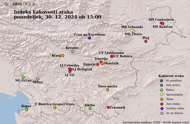 V nekaterih krajih Slovenije so se povišale ravni delcev PM10, opozarja Agencija RS za okolje (Arso). Kakovost zraka je zelo slaba na območjih Ljubljane, tudi Celja in Murske Sobote, izredno slaba pa v Črni na Koroškem.