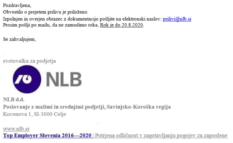 Podjetja, ki so prejela zlonamerno elektronsko sporočilo s strani pošiljatelja, ki se lažno predstavlja v imenu svetovalke za podjetja iz NLB d.d., svetujejo, da priponke ne odpirajo, podatkov v obrazec ne vnašajo in tovrstno sporočilo nemudoma pobrišejo.