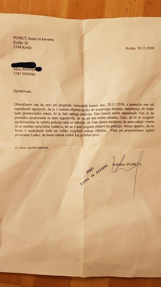 Po besedah vodstva kavarne gre za ponarejeno štampiljko in podpis, prav tako zatrjujejo, da dopis ni bil poslan naslovniku z njihove strani. Zato prosijo vse, ki ste prejeli pismo s to ali podobno vsebino, da jih o tem obvestite, lahko jim prejeto pošiljko dostavite osebno ali po pošti, nikar pa se ne obremenjujte z vsebino in obtožbami, ker gre za prevaro.