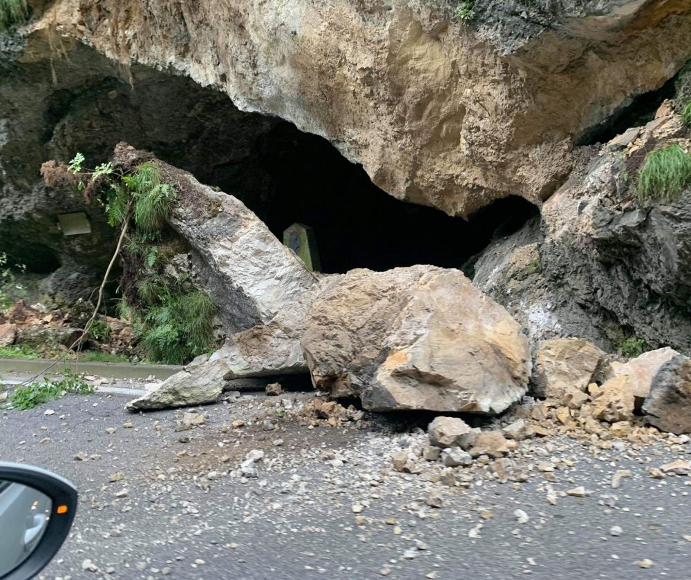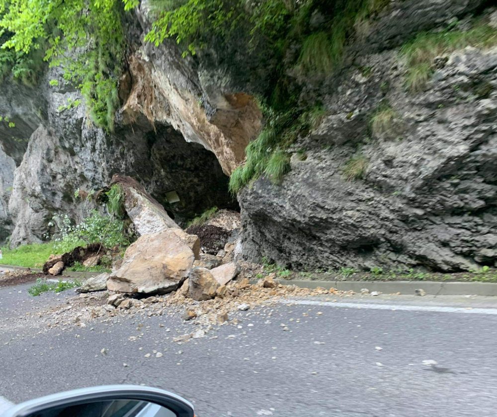 Ob 17.37 se je na regionalno cesto med Slovenj Gradcem in Velenjem, v Hudi luknji, vsul plaz skal in kamenja ter zaprl polovico vozišča.