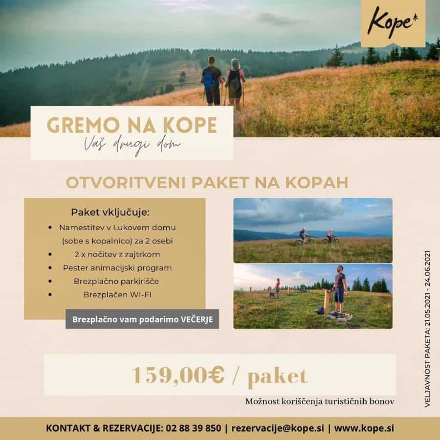 Na Kopah vam v poletnem času ponujajo pester animacijski program primeren za vse generacije in okuse. Namestitev na Lukovem domu, vrhunsko kulinariko, podate se lahko na pohodniške in kolesarske poti, na razpolago je mini trail in otroški igralni park … in še več. Preverite poletne aktivnosti na spletni strani www.kope.si. Pri njih pa lahko unovčite tudi turistične bone.