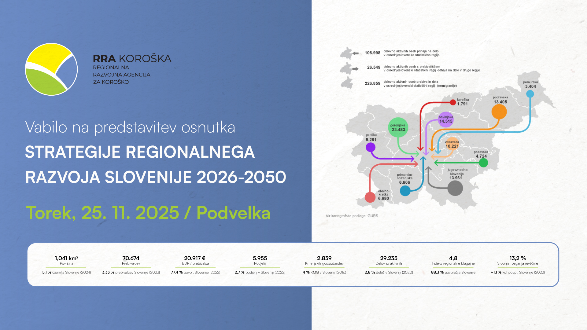 Regionalna razvojna agencija za Koroško RRA Koroške, v imenu Ministrstva za kohezijo in regionalni razvoj vabi vse člane Razvojnega sveta Koroške regije, Regijske razvojne mreže Koroške in druge zainteresirane deležnike na predstavitev osnutka Strategije regionalnega razvoja Slovenije 2026-2050, ki bo potekala v torek, 25. novembra 2025, ob 13. uri v Podvelki (Kulturni dom Podvelka, Podvelka 55, 2363 Podvelka).