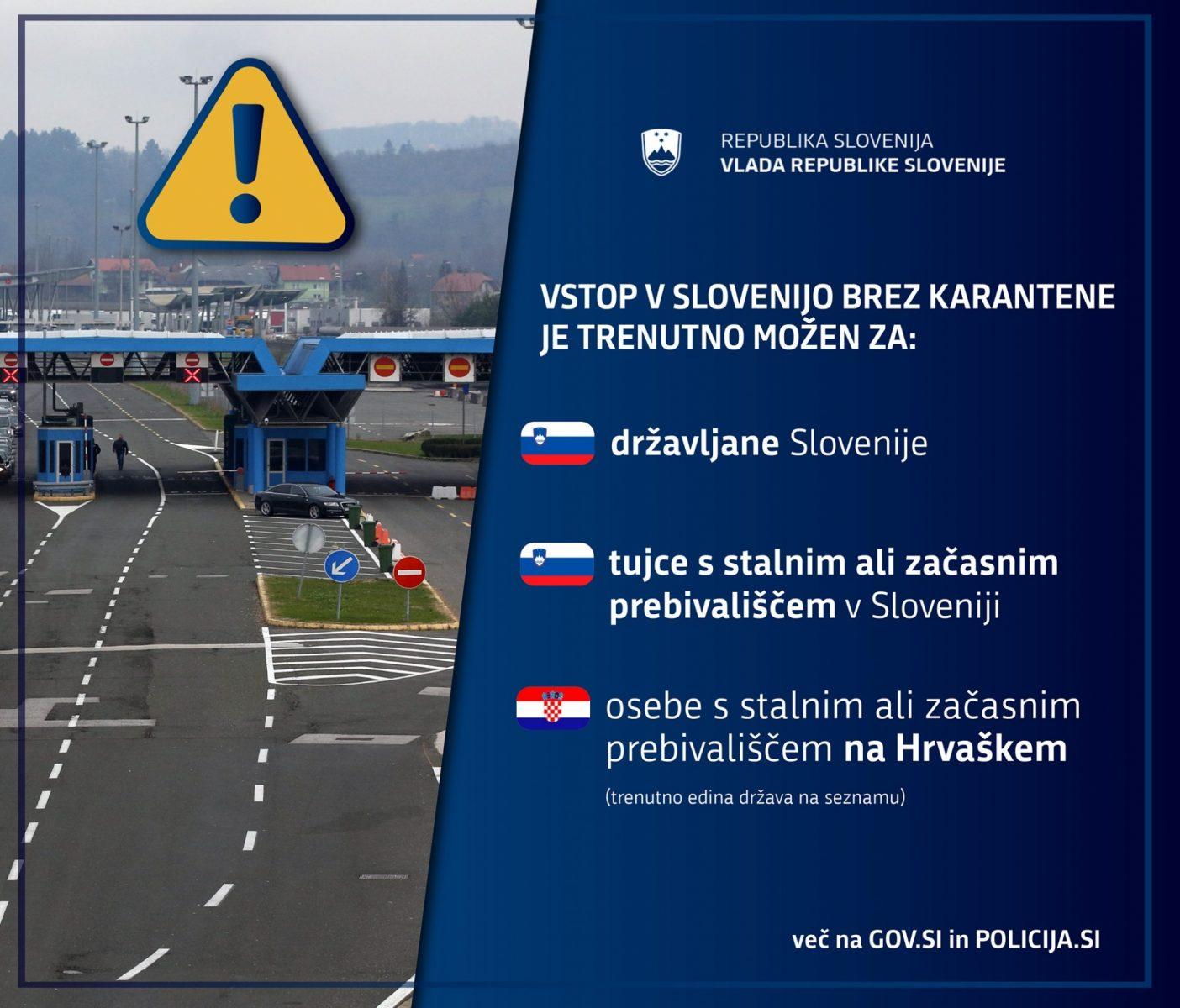 Osebi, ki vstopa v Republiko Slovenijo in ima stalno ali začasno prebivališče v državah članicah EU ali drugih državah schengenskega območja, ki niso na seznamu seznam držav, iz katerih osebe vstopajo v Republiko Slovenijo, se zaradi morebitne okužbe z virusom SARS-CoV-2 odredi karantena za obdobje 14 dni. To pa ne velja za državljane Republike Slovenije in tujce s stalnim ali začasnim prebivališčem v Republiki Sloveniji.