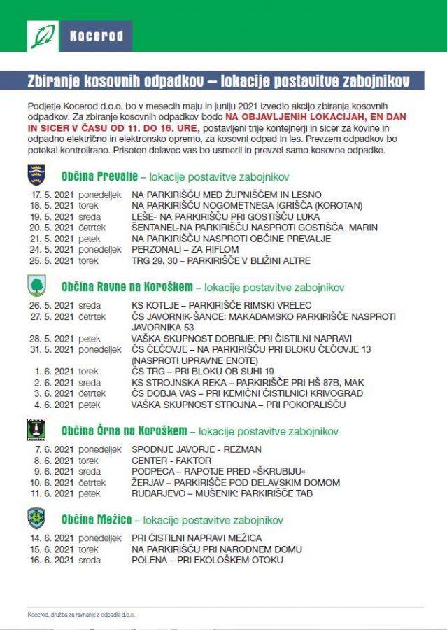 Kosovni odpadki so odpadki iz gospodinjstev, ki zaradi svoje velikosti, oblike in teže niso primerni za prepuščanje v zabojnikih, posodah ali vrečah za odpadke. V Mežiški dolini bodo organizirali odvoz teh odpadkov z zbiranjem v za to namenjenih kontejnerjih. Kontejnerji bodo na navedenih lokacijah postavljeni od 11. do 16. ure. Upoštevajte navedeni datum in uro, saj se na lokacijo po tem času ne bodo vračali, so opozorili.