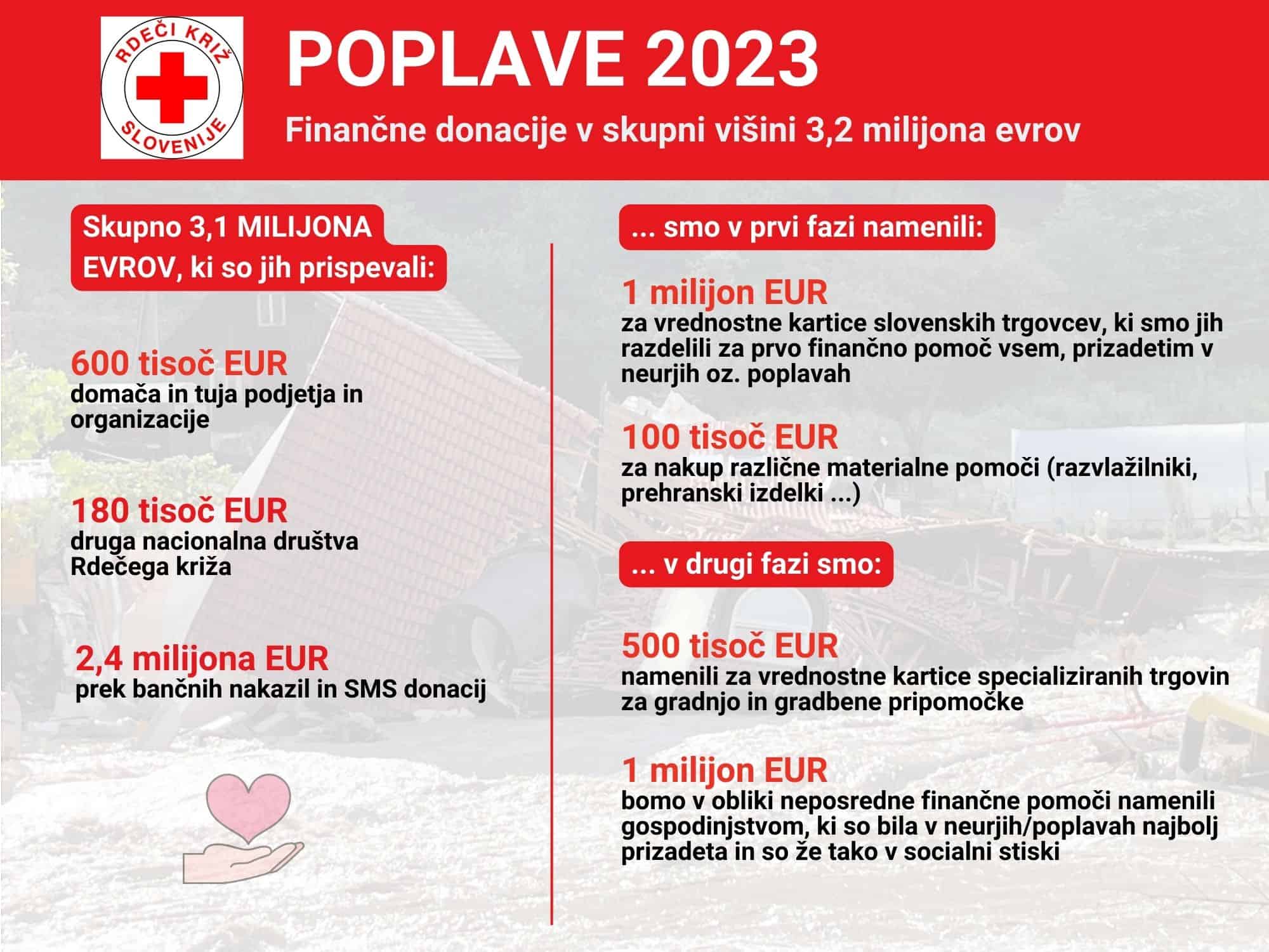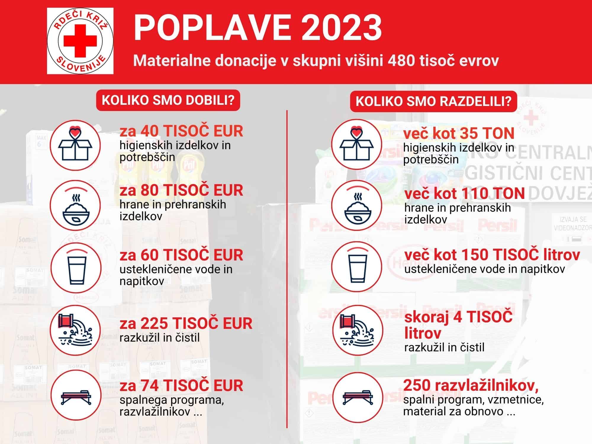 Pri Rdečem križu Slovenije so doslej prejeli za 3,2 milijona EUR donacij (poslovnih in fizičnih oseb ter SMS donacij), milijon evrov so najbolj prizadetim prek naših območnih združenj razdelili v obliki vrednostnih kartic, dostavili in razdelili so tudi za več kot 400 tisoč evrov materialne pomoči (pitna voda, hrana in prehranskih izdelki, higienski pripomočki in potrebščine, čistila …) ter več kot 200 razvlažilnikov. V celoti so razdelili tudi prvo finančno pomoč v višini 5,5 milijona EUR, ki jim jo je za pomoč pri sanaciji po neurjih oz. poplavah namenila Vlada RS – 500.112,19 EUR so razdelili med skupno 434 upravičencev, 5.001.044,00 EUR pa 4419 upravičencem.