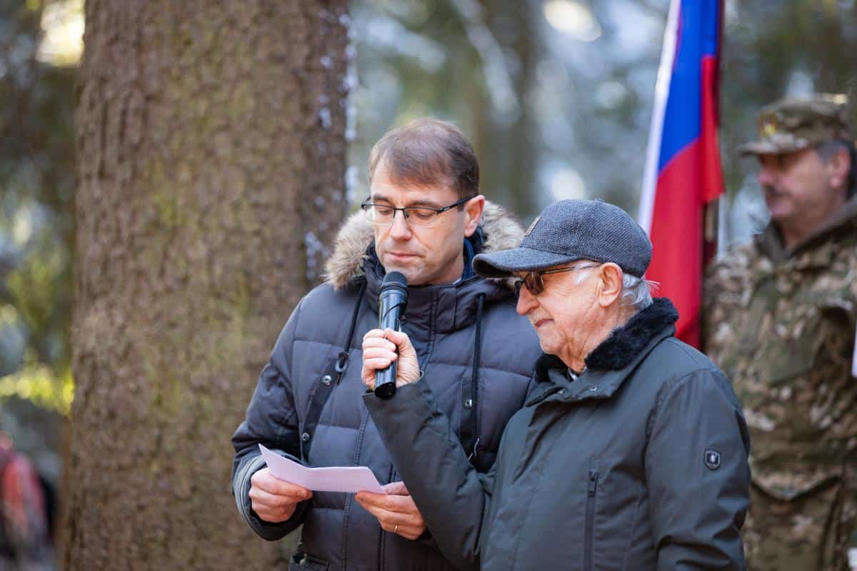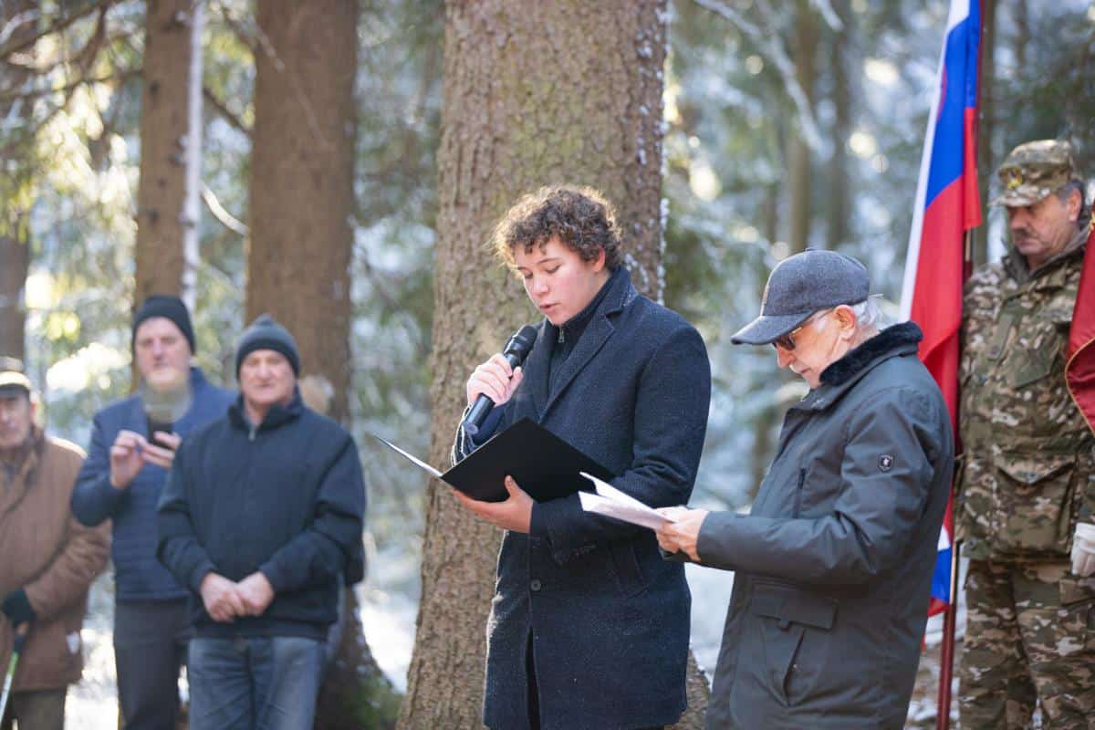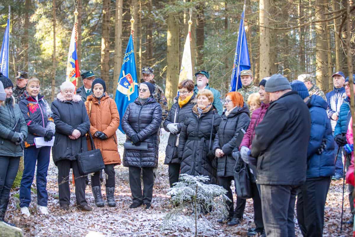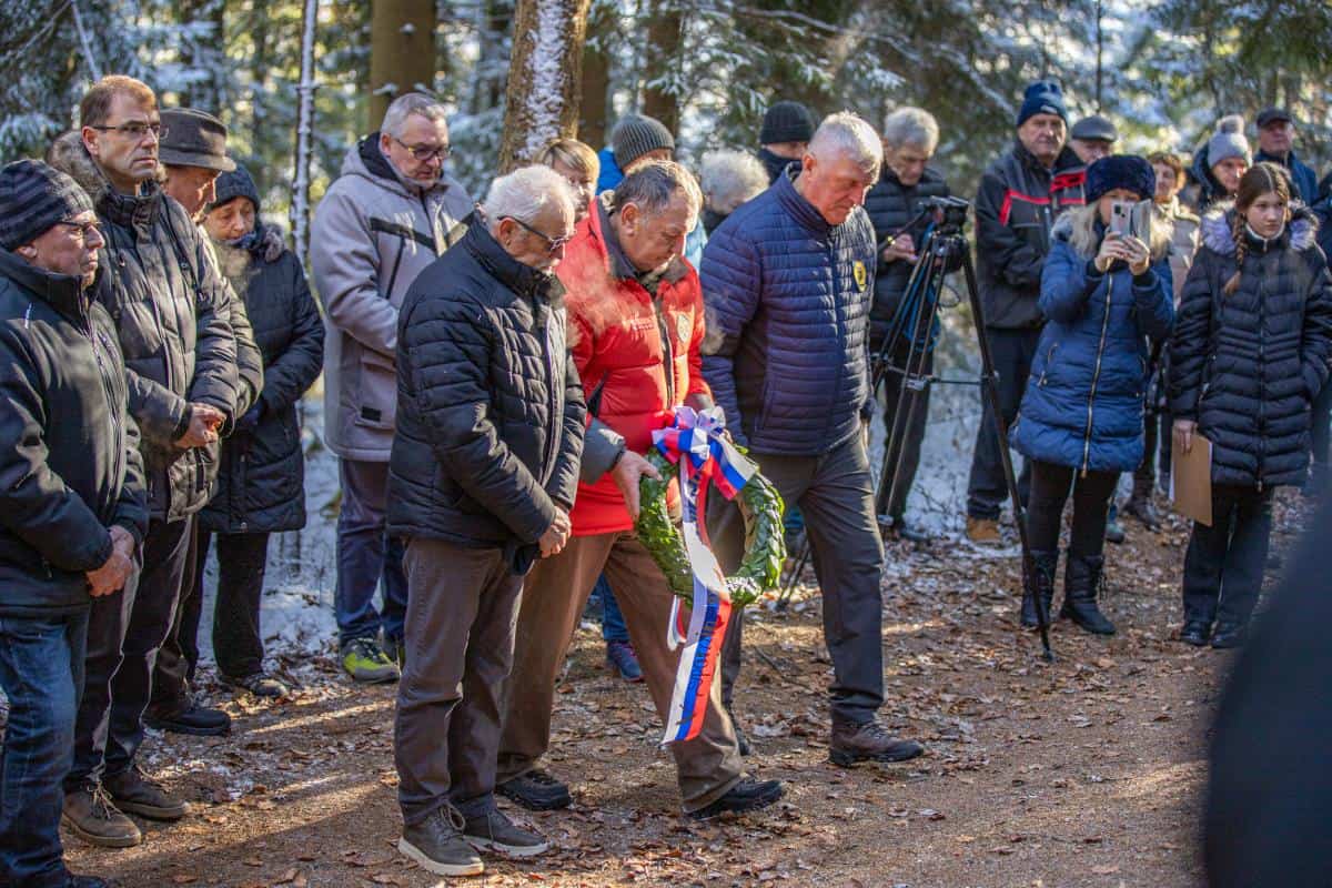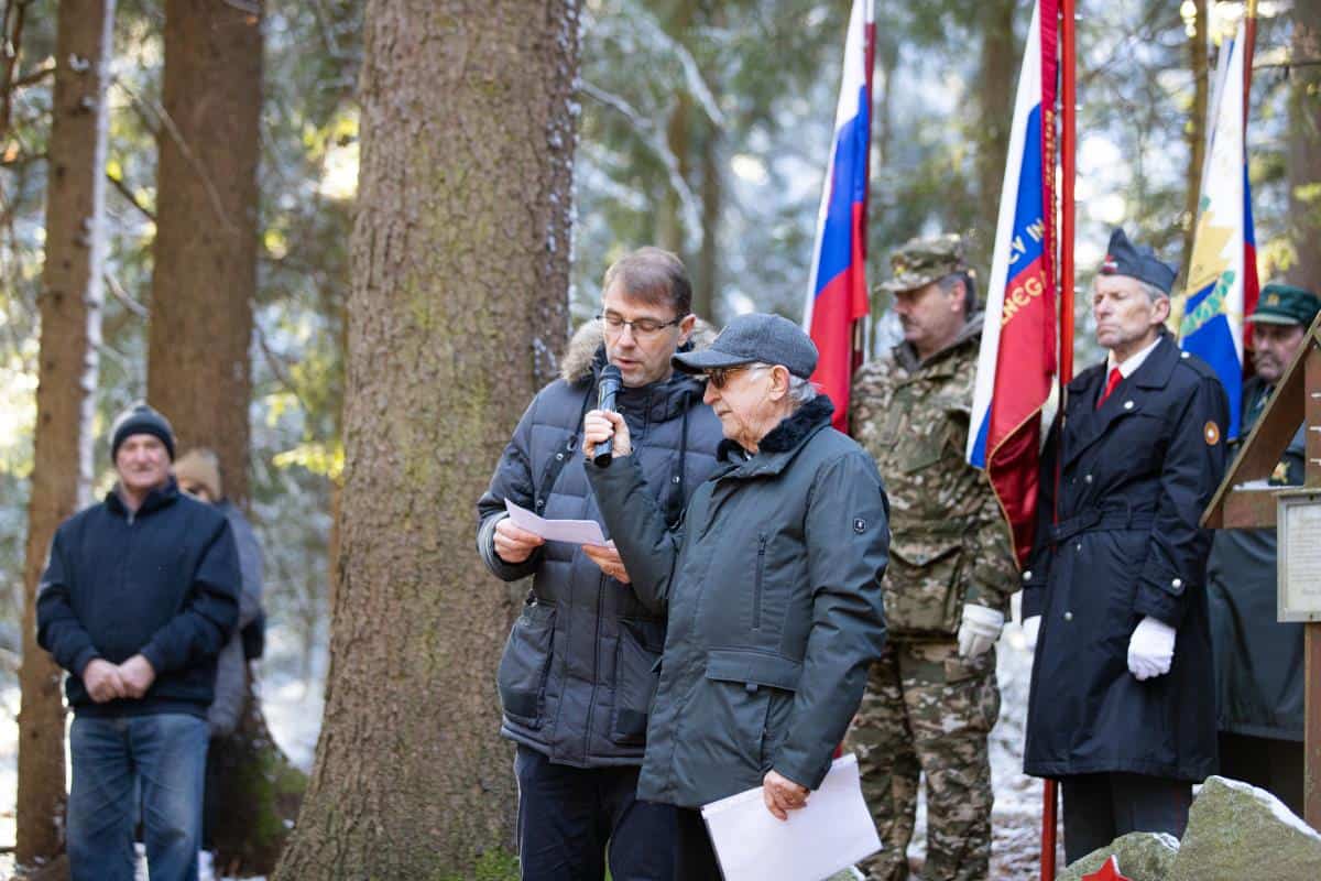 V gozdu ob sedmih granitnih kamnih z imeni talcev so prisluhnili slavnostnemu govorniku županu Občine Ravne na Koroškem dr. Tomažu Roženu.