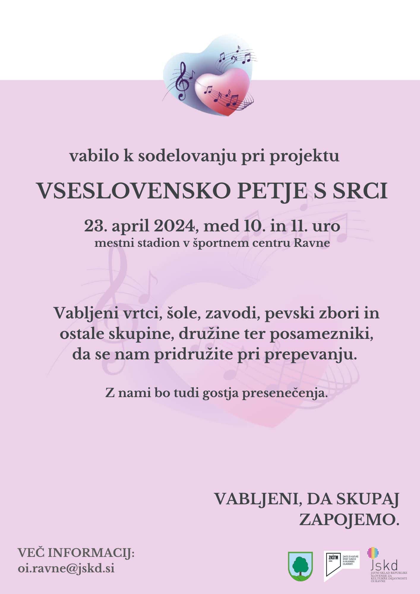 V torek, 23. aprila 2024, med 10. in 11. uro, bo petje združevalo pevce s srcem na mestnem stadionu v Športnem centru na Ravnah na Koroškem.