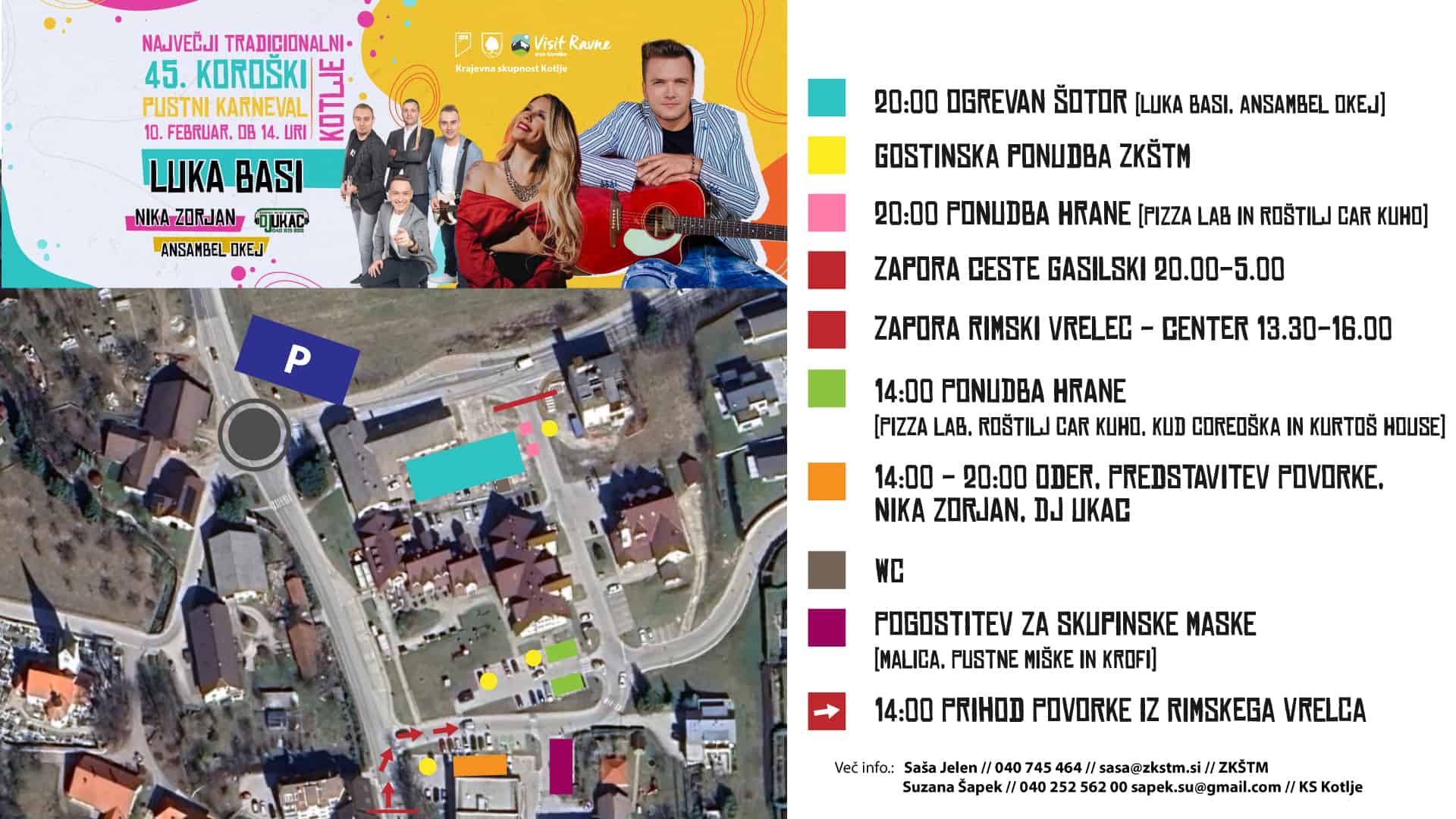 Kolektiv ZKŠTM Ravne na Koroškem v sodelovanju s Krajevno skupnostjo Kotlje prireja tradicionalni pustni karneval, letos že 45. po vrsti, ki bo navdušil ljubitelje norčij, zabave in šem. Dogodek, ki ga ne gre zamuditi, bo potekal v soboto, 10. februarja 2024, s pričetkom ob 14. uri v Kotljah.