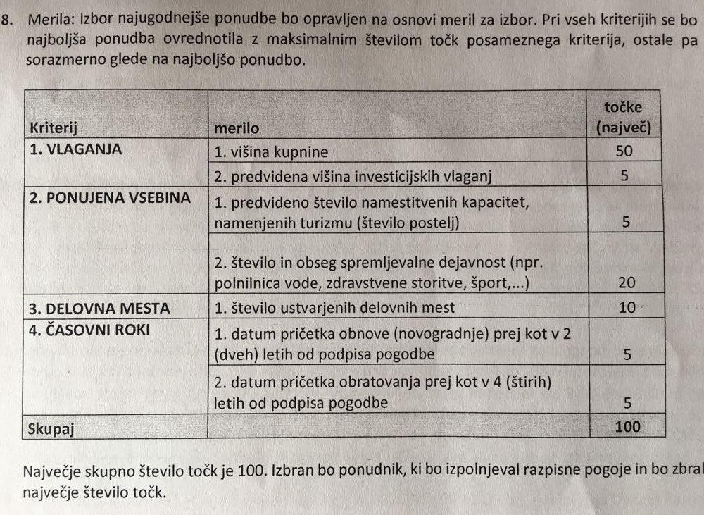 Tretja in četrta skupina pa sta od potencialnega novega lastnika zahtevali določeno število na novo ustvarjenih delovnih mest in spoštovanje predpisanih časovnih rokov. Izhodiščna cena ni bila določena, tako da je lahko ponudnik ponudil kolikor je želel. Občina je računala na vsaj 400 tisoč evrov, pri čemer varščina predstavlja 10 odstotkov celotnega zneska.