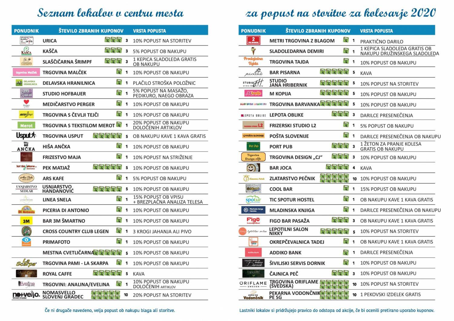 Vsak kolesar na vstopnih parkirnih kabinah v mestnem jedru prejme oštevilčen kuponček za popuste, ki so unovčljivi pri več kot 50-ih ponudnikih, označenimi s plakatom Kolesarju prijazen lokal.