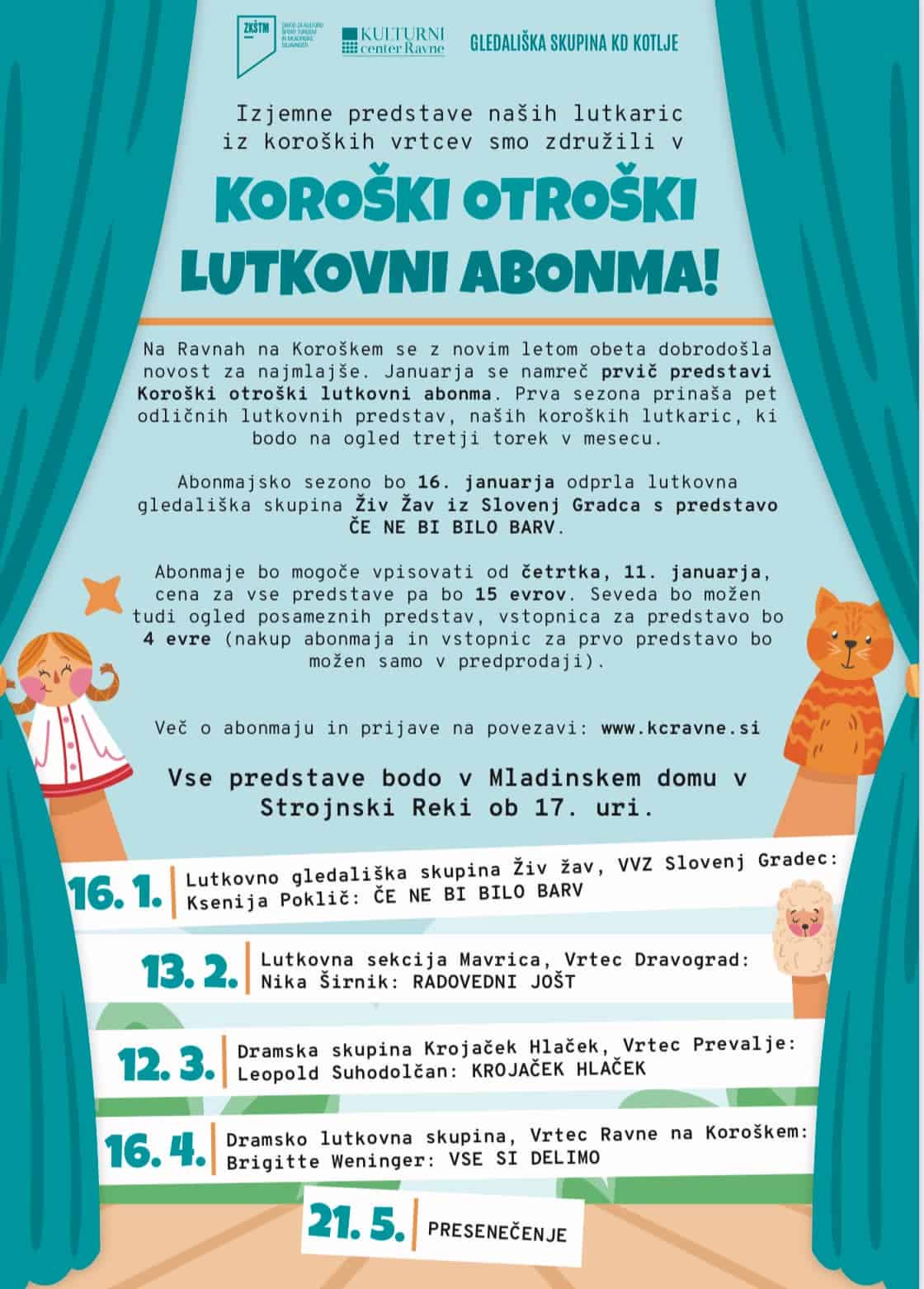 Na Ravnah na Koroškem se obeta dobrodošla novost za najmlajše - Koroški otroški lutkovni abonma, katere predstave pa bodo potekale v Mladinskem domu v Strojnski Reki.