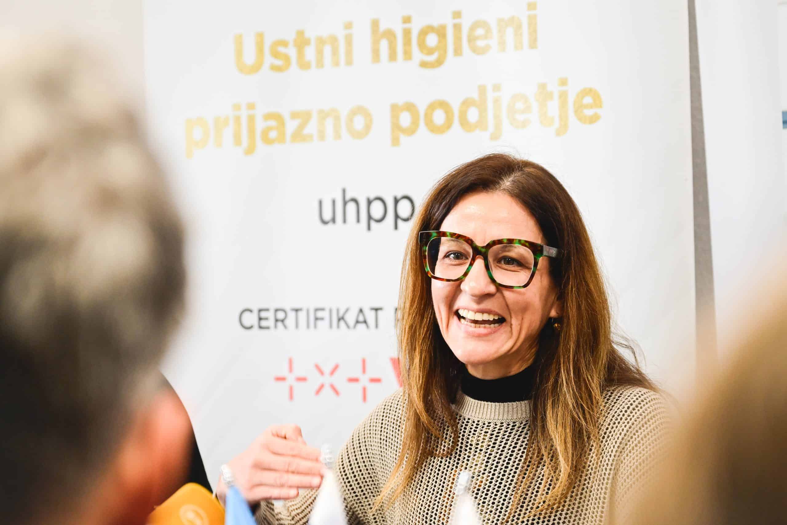 Dr. Vesna Kaloh je poudarila: »Ko smo razmišljali, kdo v našem podjetniškem okolju bi lahko bil prvi, ki bi mu predstavili projekt in bi z njim odlično sovpadal, smo najprej pomislili na uspešno mariborsko podjetje Mikro+Polo, ki je splošno znano po tem, da je izjemno prijazno do svojih zaposlenih. Ko sva skupaj z možem predstavila projekt UHPP Marku Verdevu iz Mikro+Pola, je želel takoj biti del tega. In danes smo tukaj, da certifikat »Ustni higieni prijazno podjetje« tudi uradno predamo podjetju Mikro+Polo.«