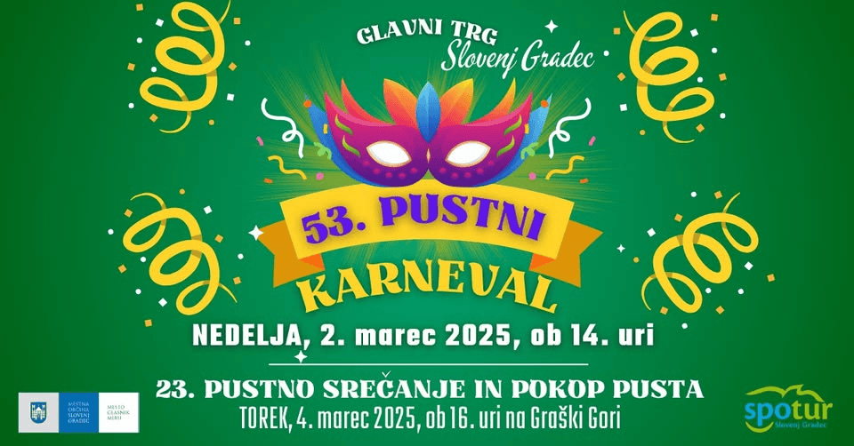 Ne zamudite pustnih norčij v Slovenj Gradcu! Oblecite najbolj norčavo masko in se pridružite največji pustni zabavi v mestu. Se vidimo na karnevalu.