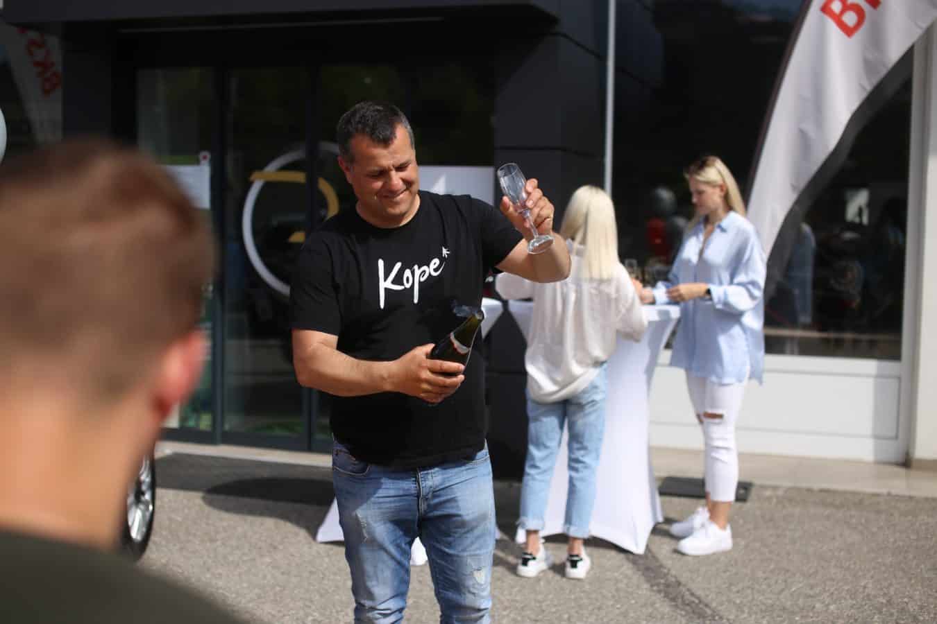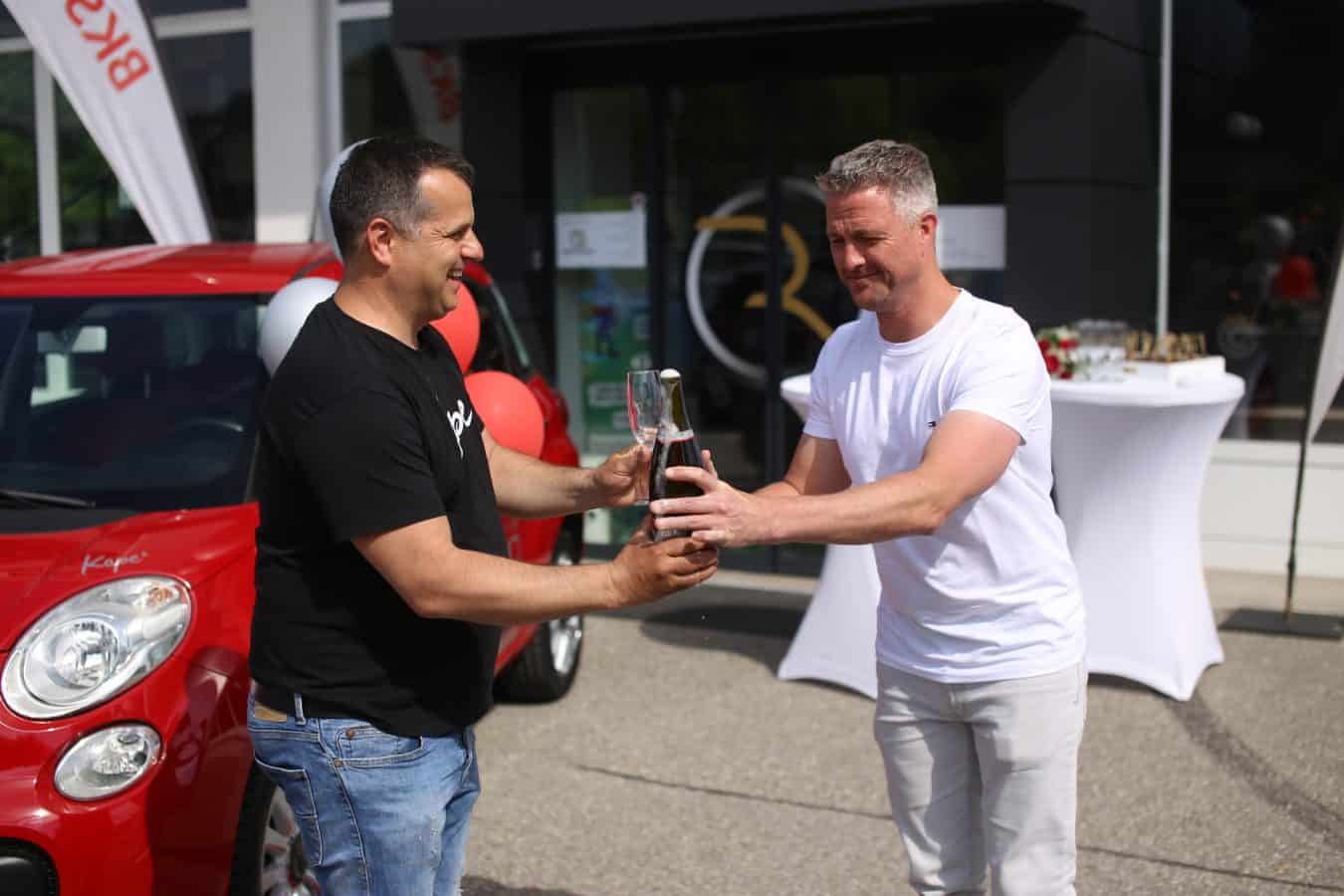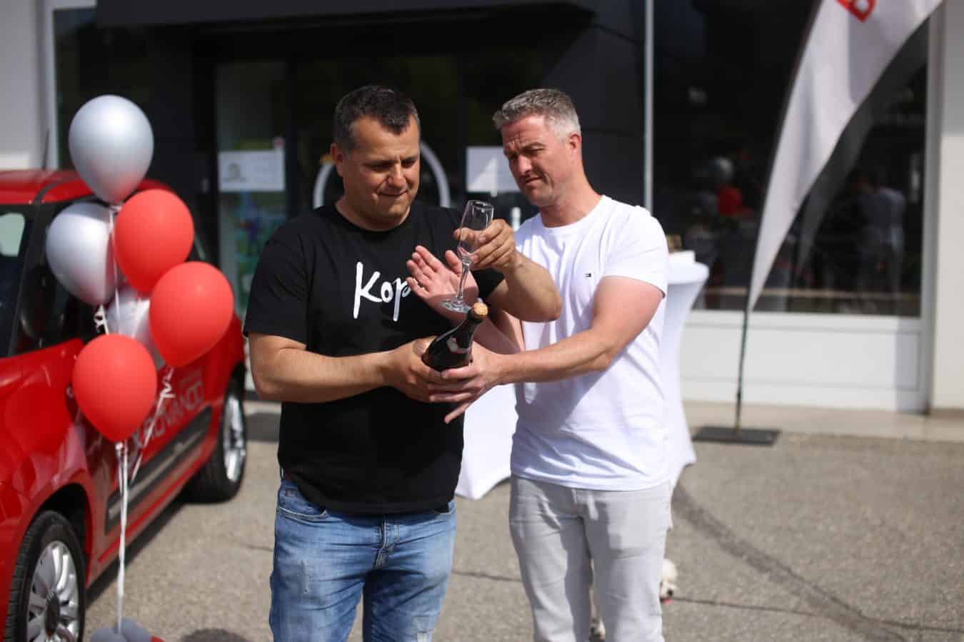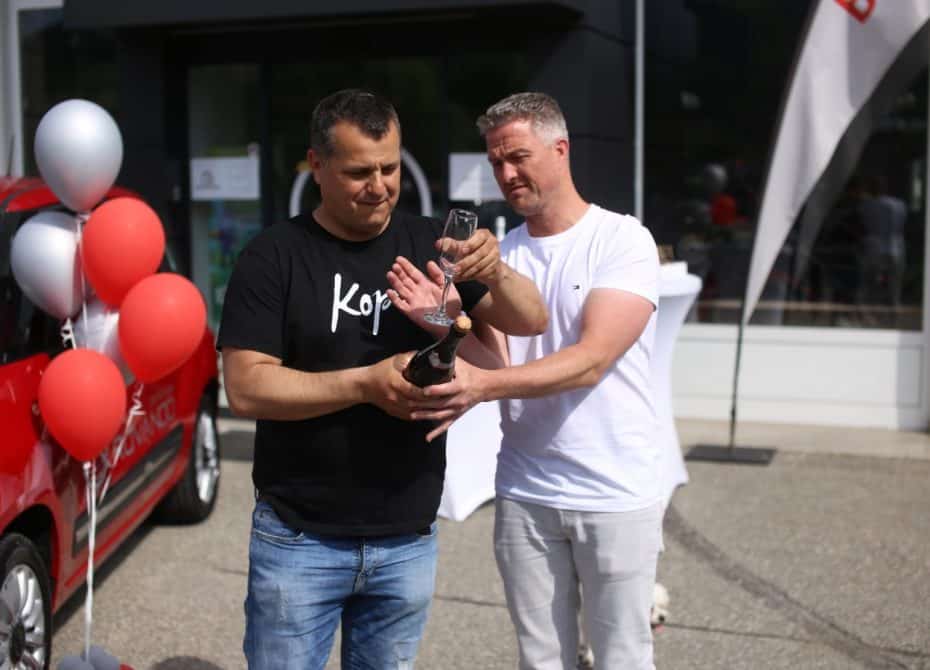 Ob današnji predaji avtomobila pa so prisotni nazdravili še s šampanjcem, ki sta ga odprla Ralf Schumacher ter Boštjan Paradiž, direktor podjetja Vabo.