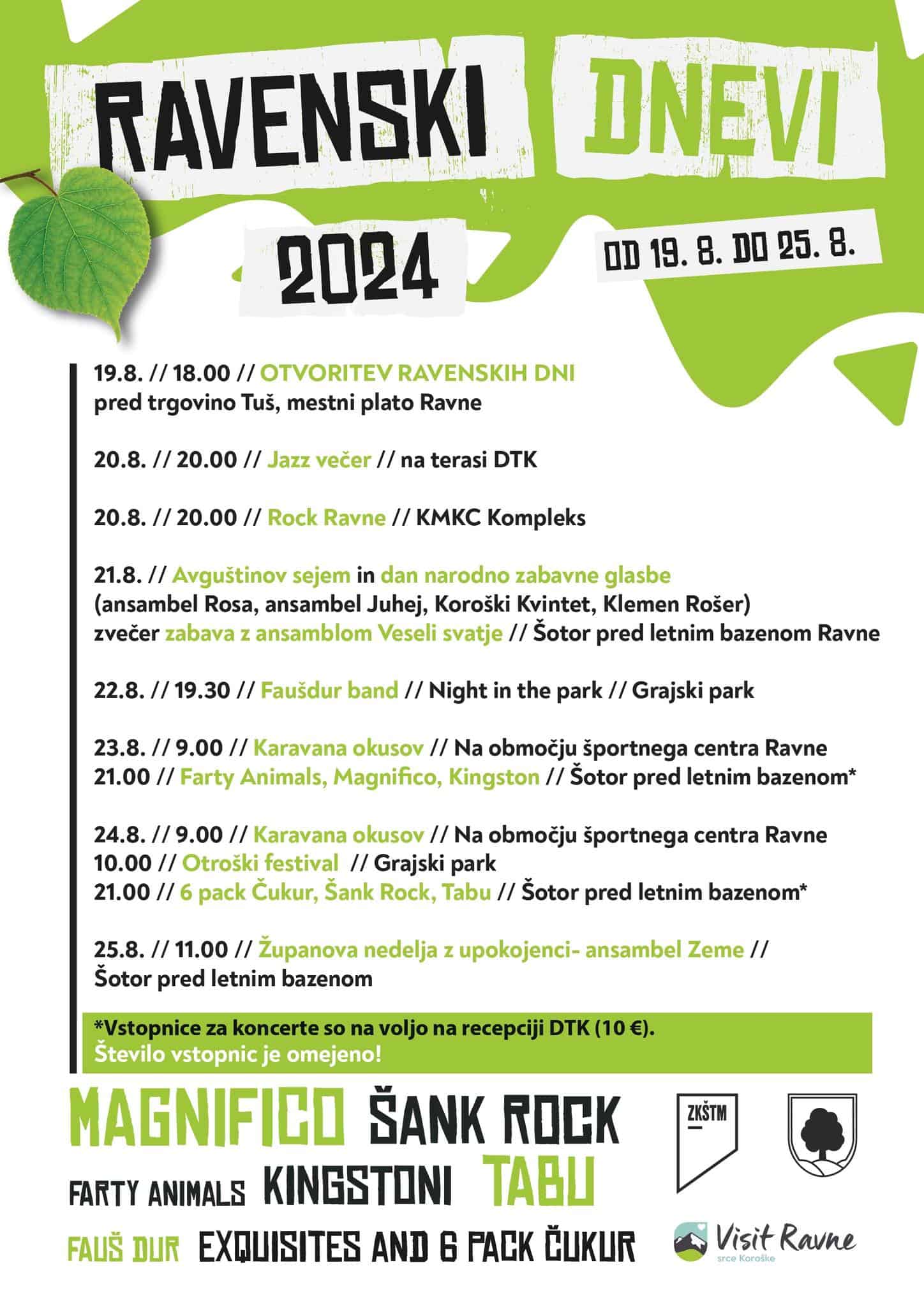 Petek, 23. avgusta: Karavana okusov bo na območju športnega centra Ravne ponudila pravo kulinarično doživetje. Za večer poln pestre glasbe bodo od 21.00 ure dalje poskrbeli Farty Animals, Magnifico ter skupina Kingston.
