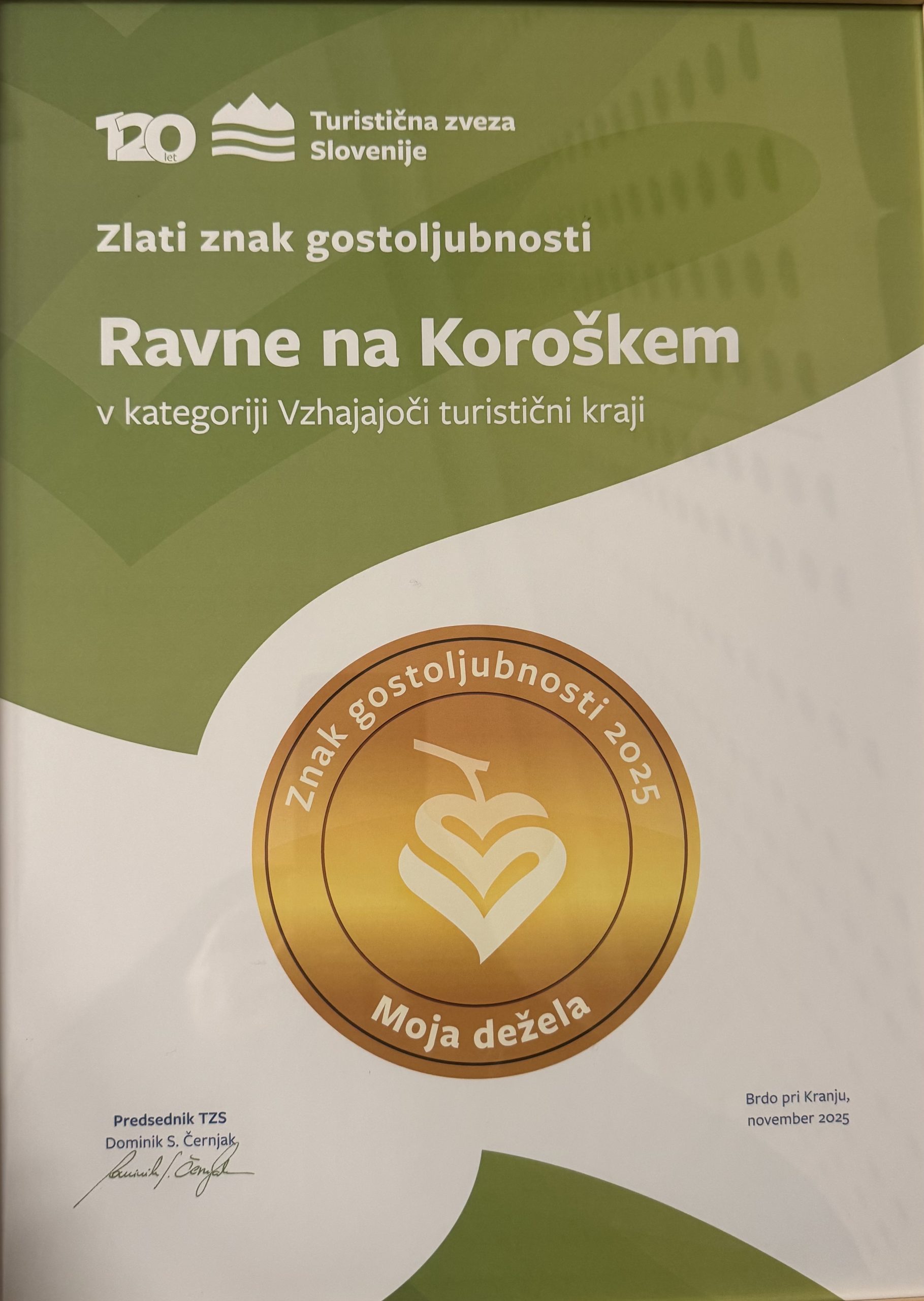 Občina Ravne na Koroškem je prejela zlato priznanje v okviru nacionalne akcije Moja dežela – znak gostoljubnosti 2025 in si prislužila prestižno priznanje v kategoriji vzhajajoči turistični kraji, kar potrjuje uspešen razvoj destinacije, urejenost kraja ter prijaznost do obiskovalcev.