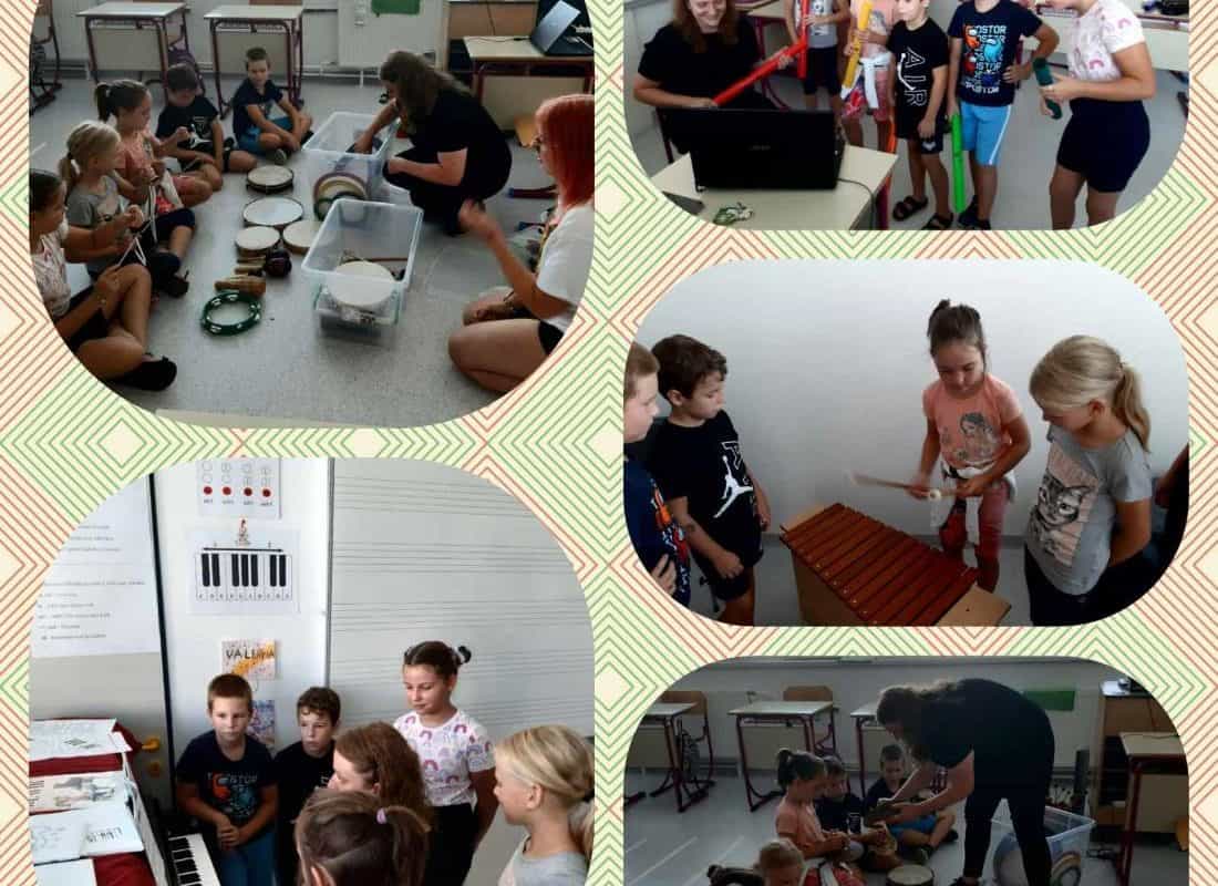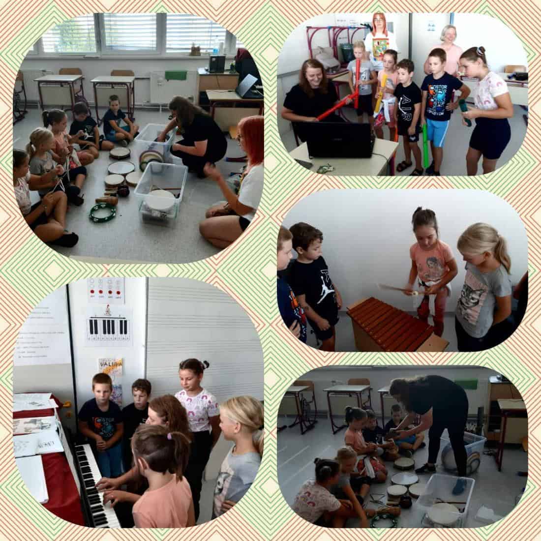 Sreda je bila v znaku obiska Glasbene šole, kjer je Ana Hübscher Jenko otrokom predstavila zvrsti glasbe, skupine glasbil, note in še marsikaj. Igrali so na male ritmične inštrumente, ksilofon in klavir. Zagotovo je bilo za otroke zelo zanimivo igranje s cevmi Boomwhackers ter na ritmična glasbila (Percussion).