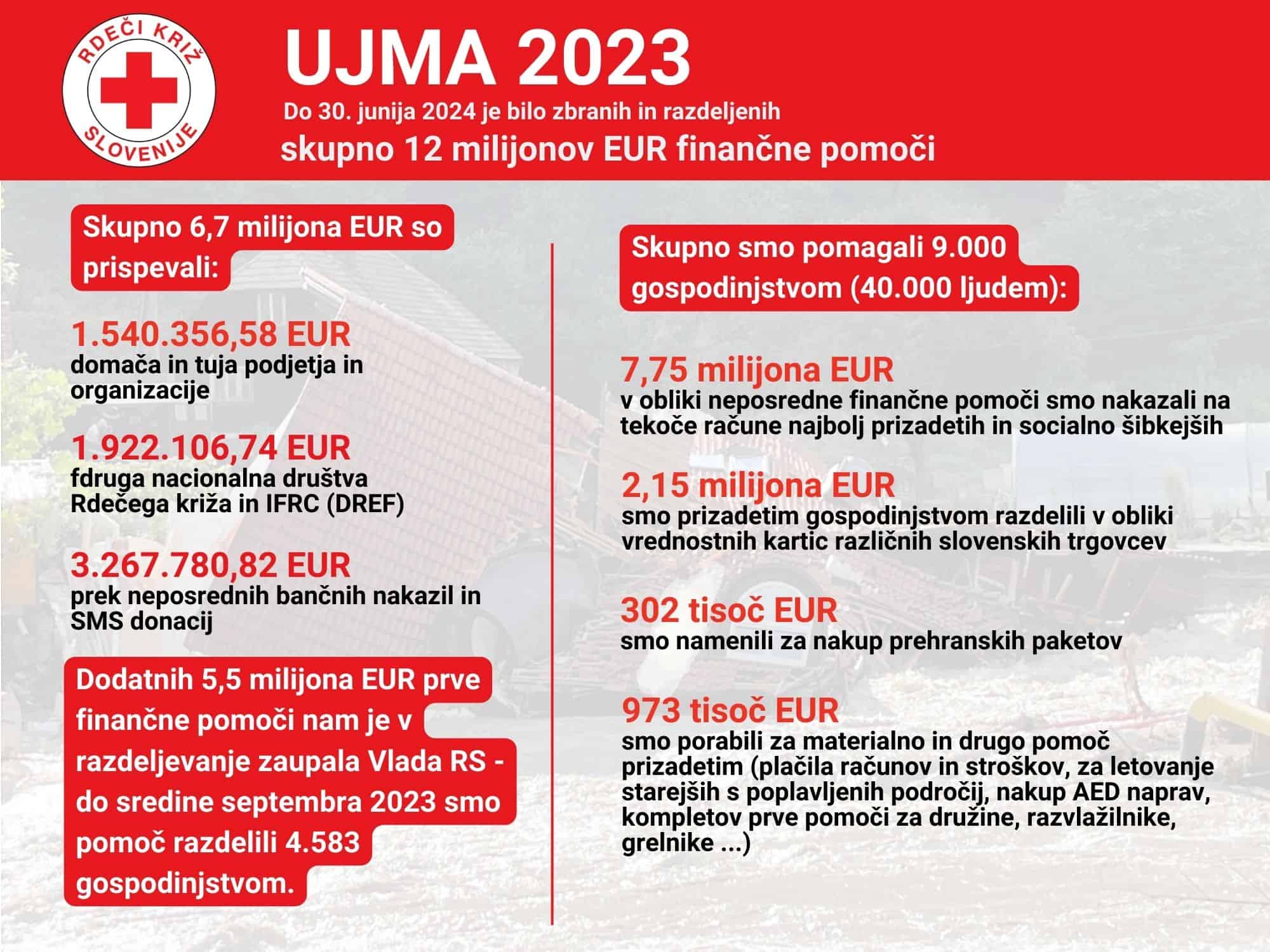 Do 30. junija 2024 so pri Rdečem križu Slovenije dobili in razdelili skupno 12 milijonov EUR pomoči, ki so jo razdelili 9.000 gospodinjstvom oz. 40 tisoč ljudem, prizadetih v ujmah: