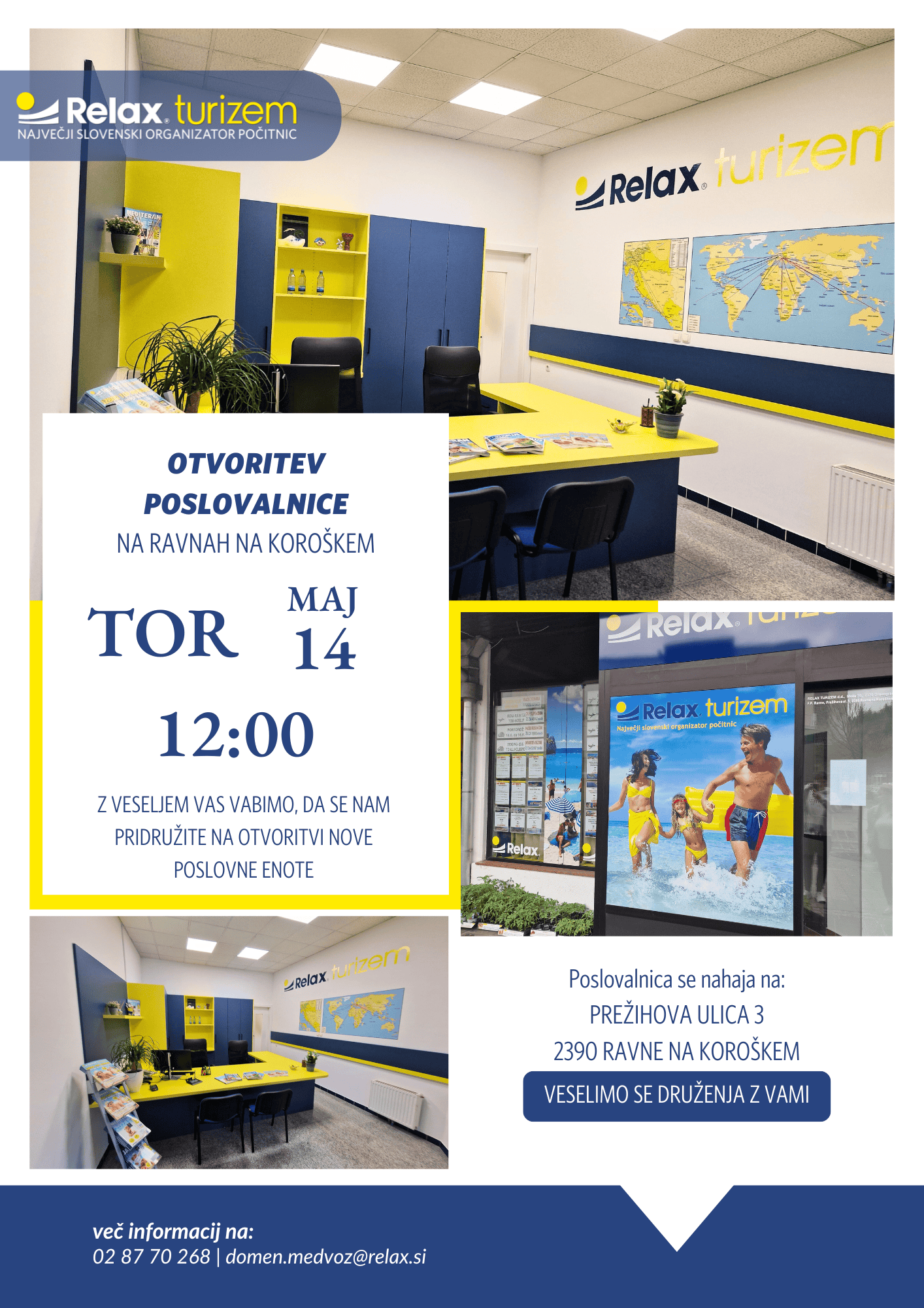 Nova poslovna enota na Ravnah na Koroškem je zasnovana po principu prijetnega, toplega svetovalnega prostora, kjer se gost dobro počuti. Zaposlili so mlade posameznike, ki so navdušeni nad potovanji in svetujejo s srcem, ter se bodo razveselili vsakega obiskovalca, ki jim bo prepustil odločitev za svoje počitnice. Veselijo se dela z vsemi gosti, ki jih bodo obiskovali v našem novem svetovalnem centru Relax Turizem d.d.