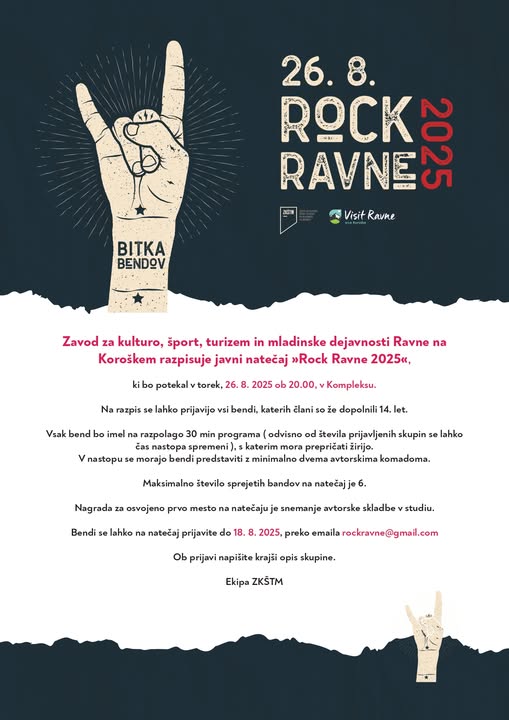 Na bitko bendov Rock Ravne se lahko prijavite do 18. avgusta 2025, oziroma do zapolnitve mest, preko e-pošte rockravne@gmail.com.