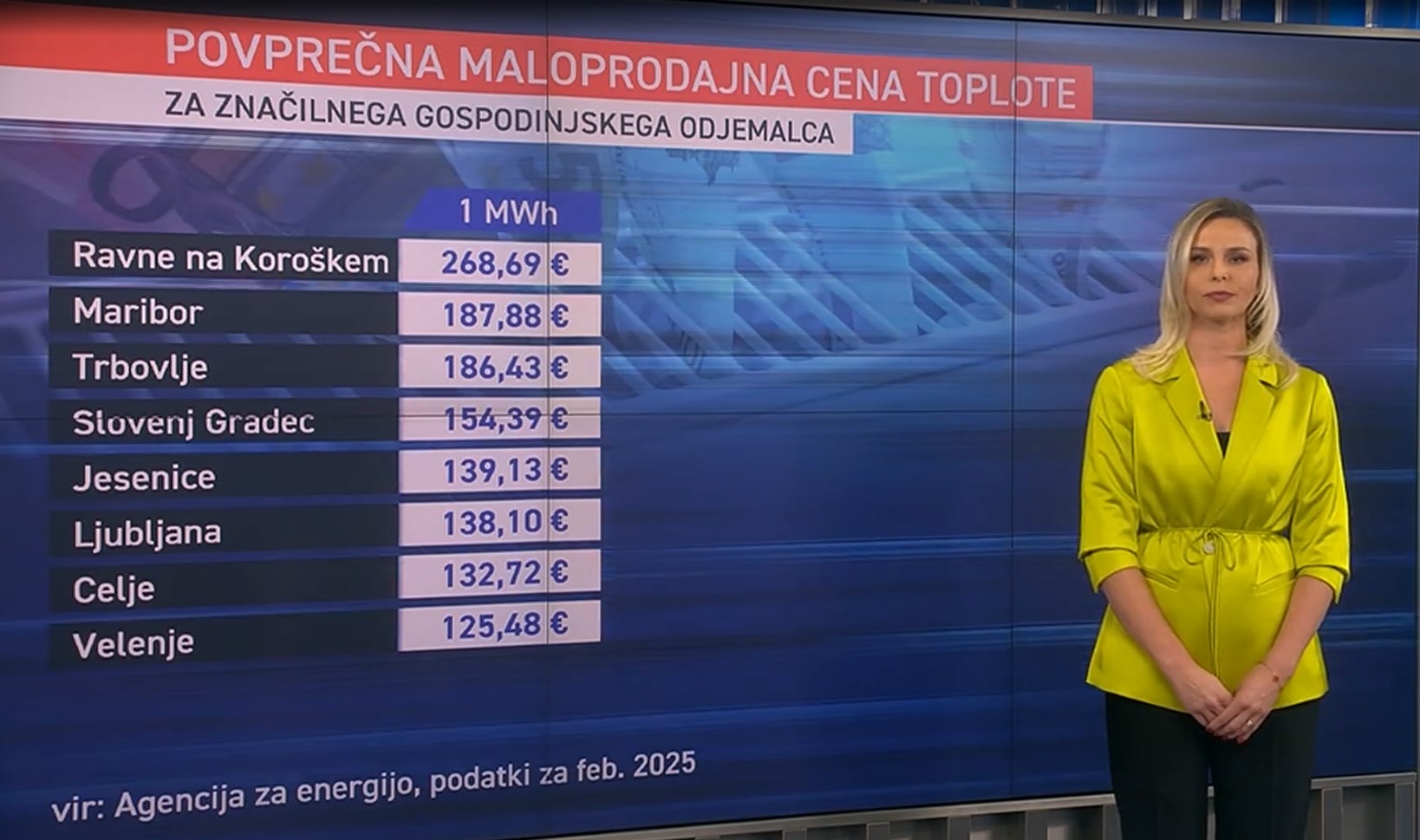 Najnižjo ceno po poročanju portala zagotavlja distribucijski sistem daljinskega ogrevanja v Velenju, kjer za megavatno uro občani odštejejo zgolj 125€, kar je v primerjavi s ceno na Ravnah več kot pol bolj ugodno.