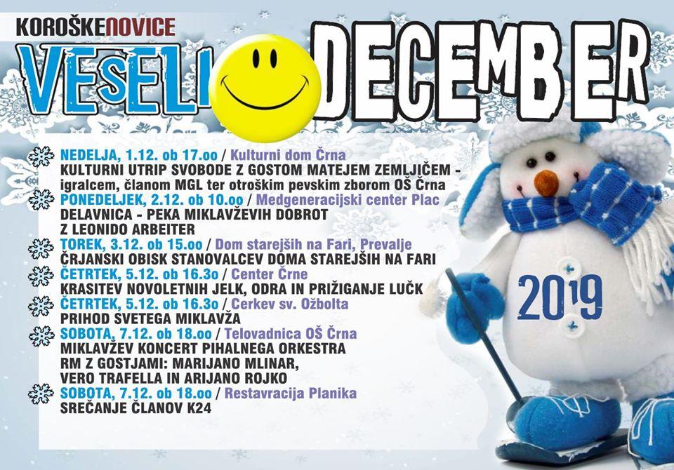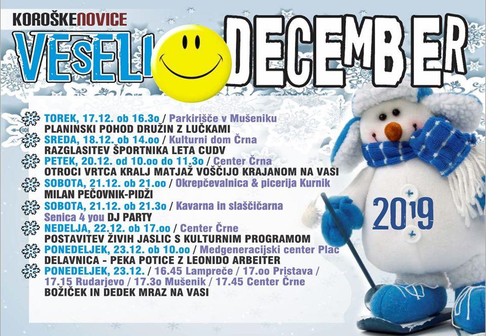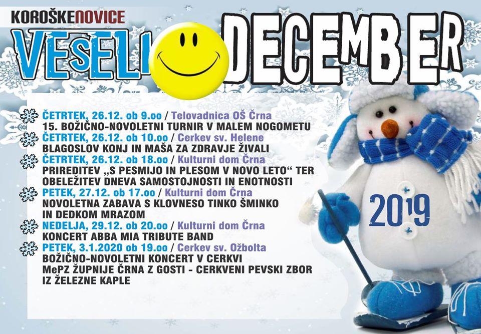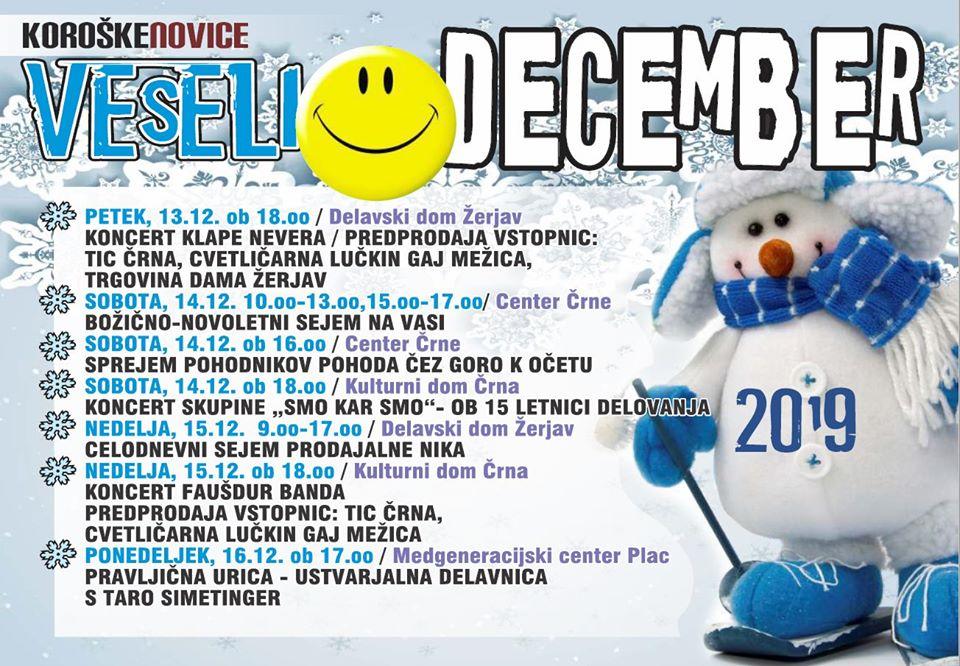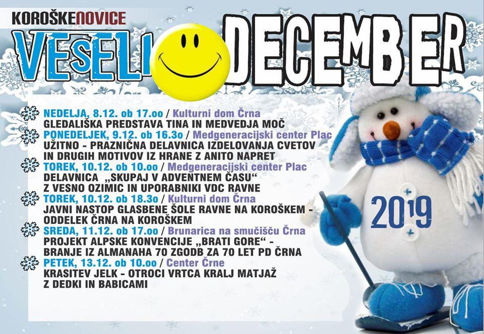 Danes, 5. 12. 2019, bodo v središču Črne okrasili jelke in praznični oder, s prižigom lučk simbolično otvorili dogajanje v veselem decembru ter se razveselili Miklavža. V soboto, 7. 12. 2019, bodo za praznično vzdušje poskrbeli člani Pihalnega orkestra RD Mežica z gostjami, istočasno se bodo v restavraciji Planika družili člani K24. Prvi teden prazničnega decembra pa bodo v Črni zaključili z gledališko predstavo, Tina in medvedja moč.