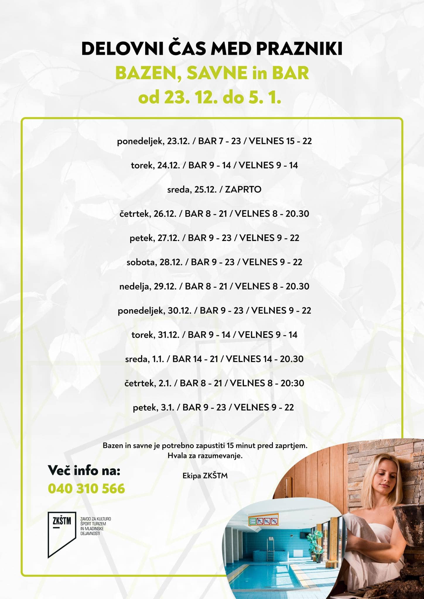 Od ponedeljka, 23. decembra 2024, in vse tja do nedelje, 5. januarja 2025, bodo savne, bazen in bar odprti po spremenjenem delovnem času in sicer: