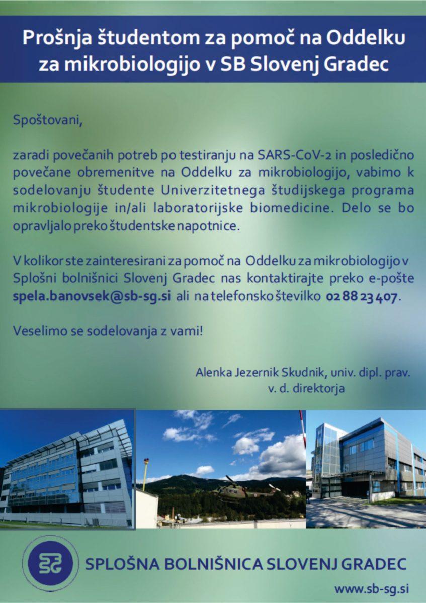 K sodelovanju pa so povabili tudi študente za pomoč na Oddelku za mikrobiologijo SB Slovenj Gradec, ki bodo lahko delo opravljali preko študentske napotnice.