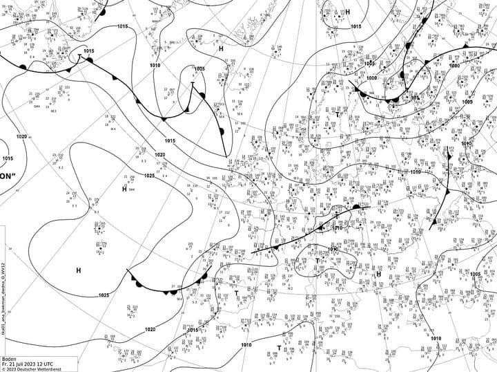 Slika: sinoptična karta nad Evropo, na kateri je vidno ciklonsko območje na severu Evrope ter hladna fronta na severni strani Alp.