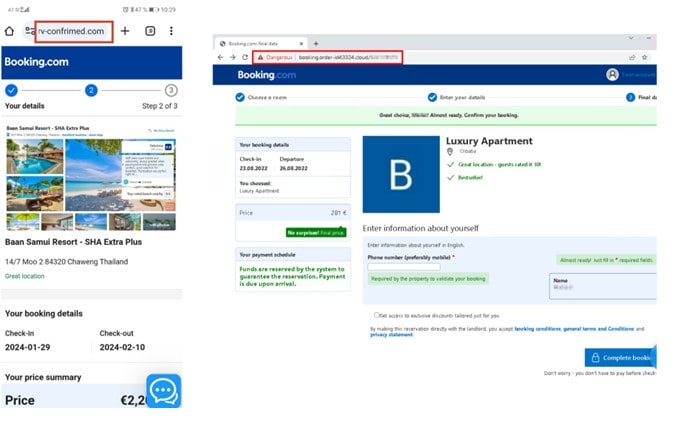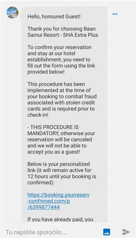 Povezava v prejetem sporočilu, prek katere naj bi uporabnik opravil ponovno rezervacijo in plačilo nastanitve, vodi na lažno spletno stran, ki zelo dobro kopira podobo platforme Booking.com.