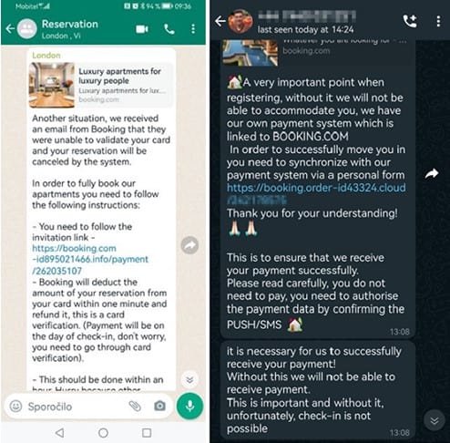Po opravljeni rezervaciji goljufi uporabnika kontaktirajo prek WhatsAppa ali katere druge platforme za hipno sporočanje. Obvestijo ga, da je bila rezervacija odpovedana zaradi težav s preverjanjem kreditne kartice na Bookingu, pri čemer lahko tudi sami dejansko odpovejo rezervacijo. Ob tem pa uporabniku ponudijo možnost, da nastanitev ponovno rezervira in plača kar preko povezave v sporočilu.